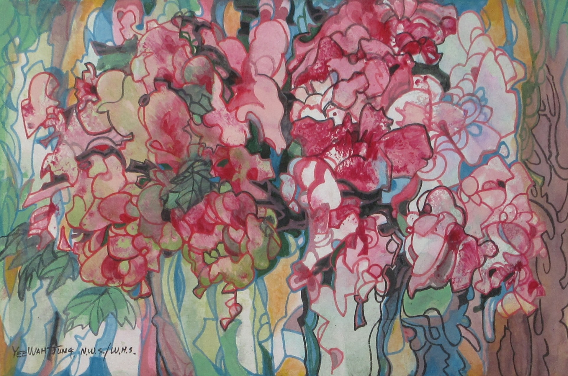 A small abstract floral painting, mounted on watercolor paper and on a mat board frame.