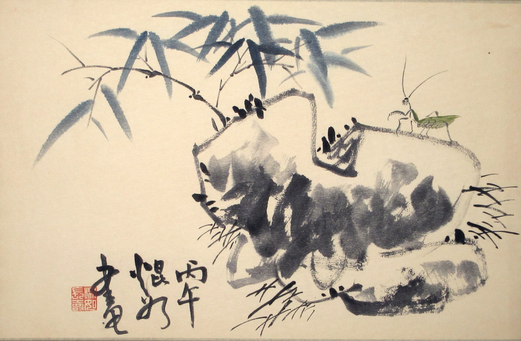 A painting of a praying mantis on a rock near bamboo and grasses. Mounted on paper with a green border.