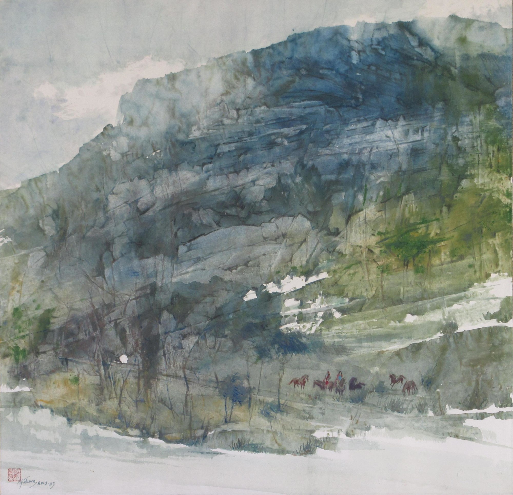 Two riders among a small herd of horses near a blue tinged mountain. Mounted on paper with a brocade border.