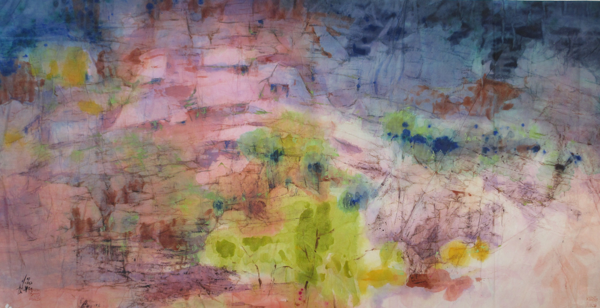 An abstract landscape with what appears like dwelling entrances in the upper levels of the cliff. Unmounted rice paper.