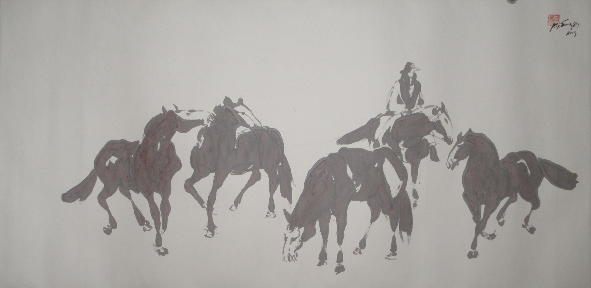 A rider with four horses. Mounted on paper with a brocade border.