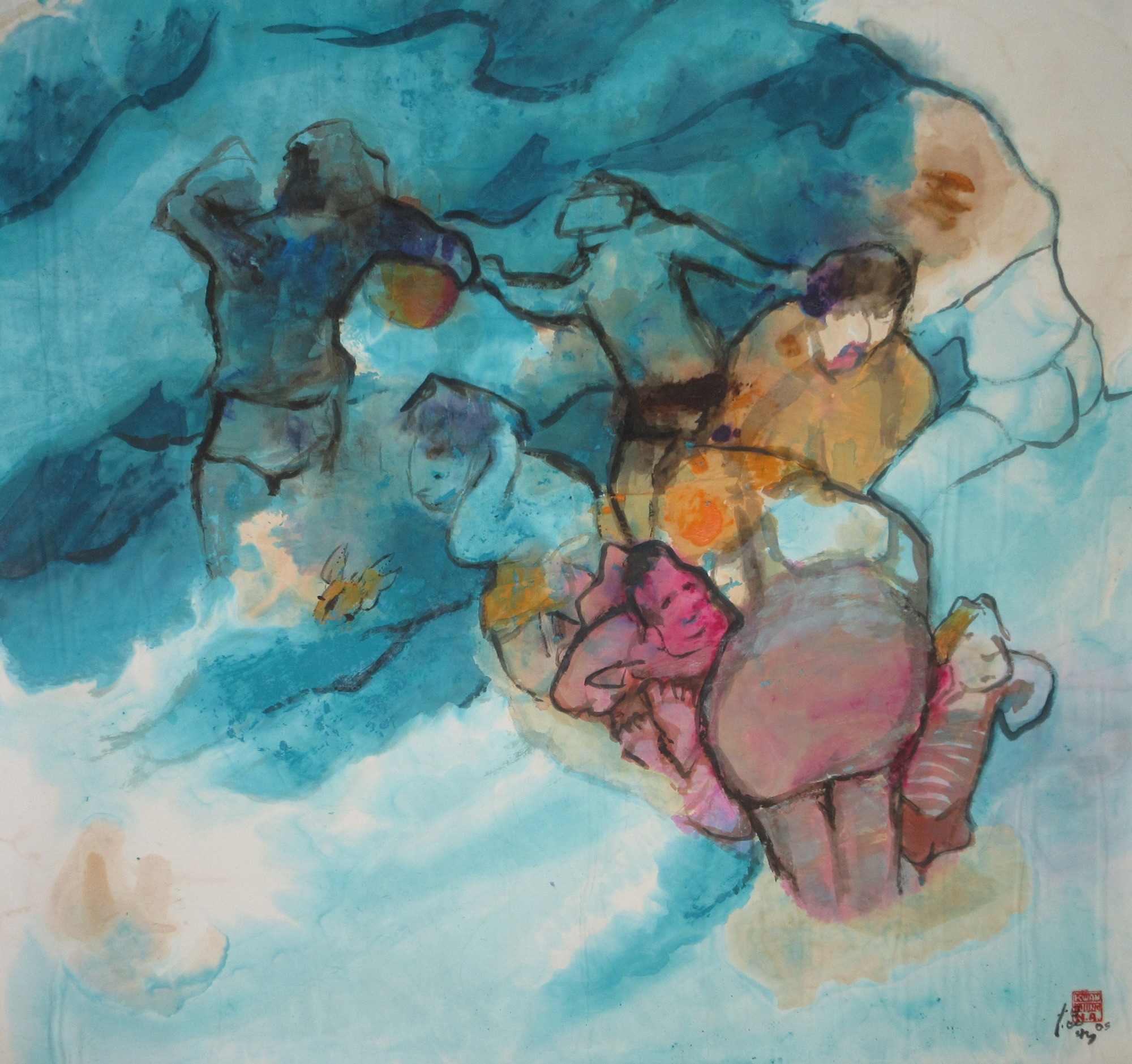 A mix of people in various swimwear wading at the beach. A lobster makes it's presence known, surprising a swimmer. One of Kwan's amusing paintings. Mounted on watercolor paper.