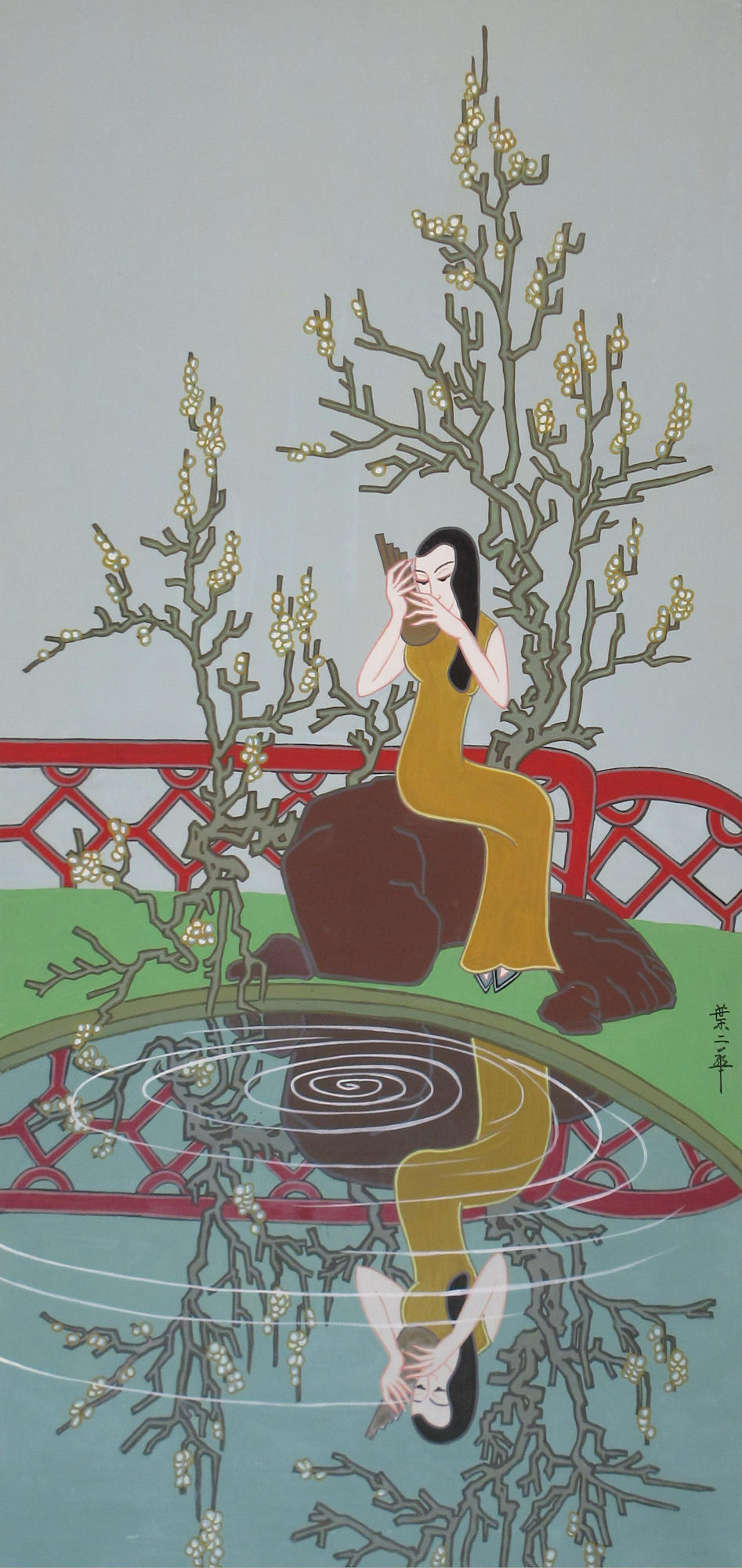 A woman playing the sheng, seated on a rock near a reflection pool. Similar to #2470 "Jade Flute with Cool Finger" by Poon.