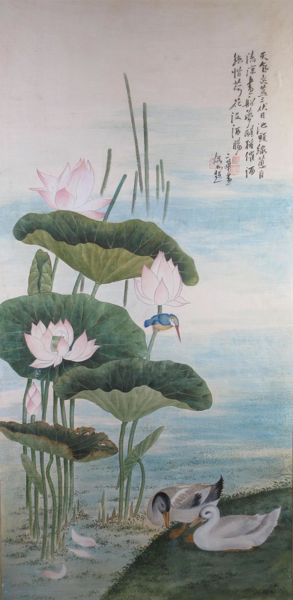 - Signature: Chinese signature, three Chinese chop seals, calligraphy.