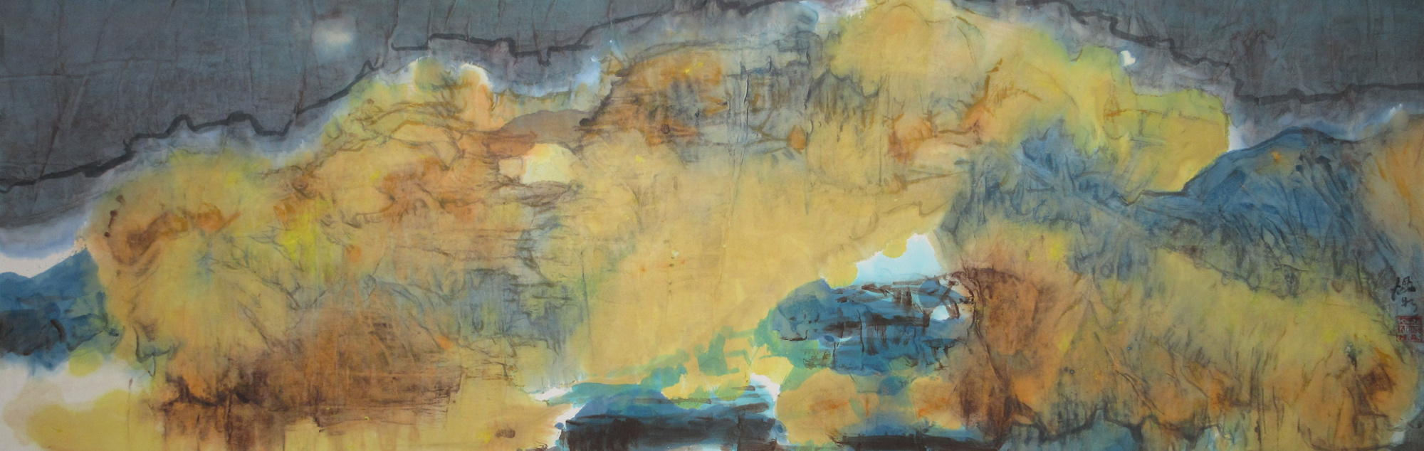 The moon attempts to gleam through a dark sky in this abstract landscape. Mounted on watercolor paper.