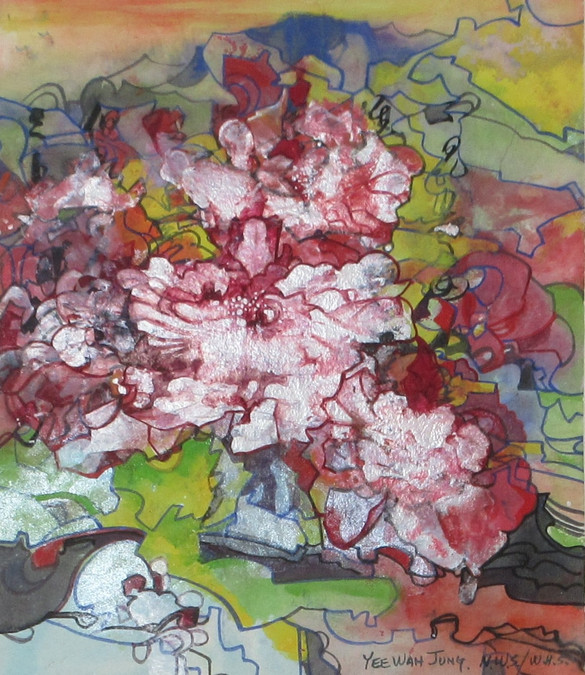 An abstract set of red flowers with white impasto, mounted on watercolor paper and mat board.