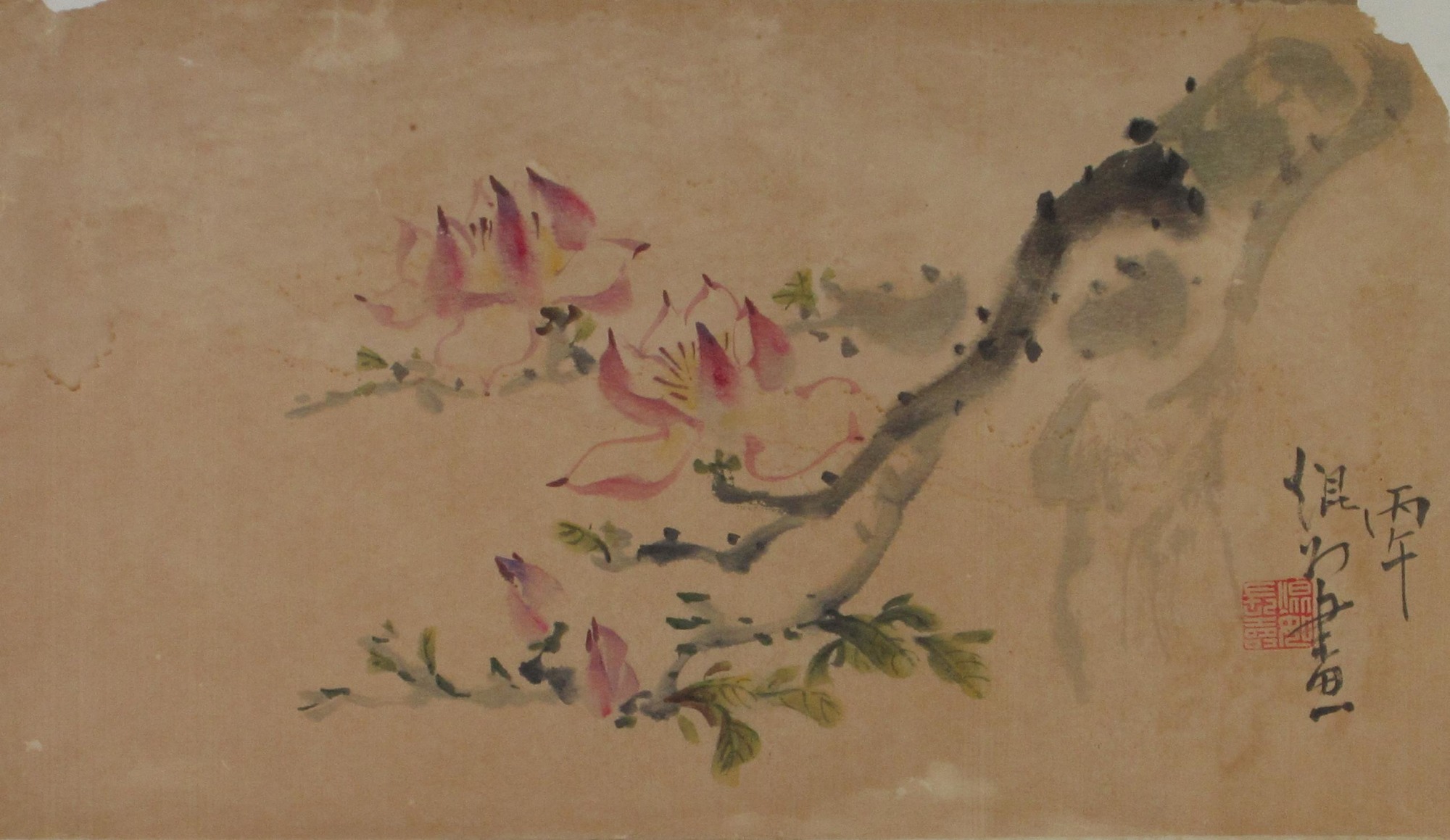 Several magnolia blossoms and buds on a branch. Mounted on paper.