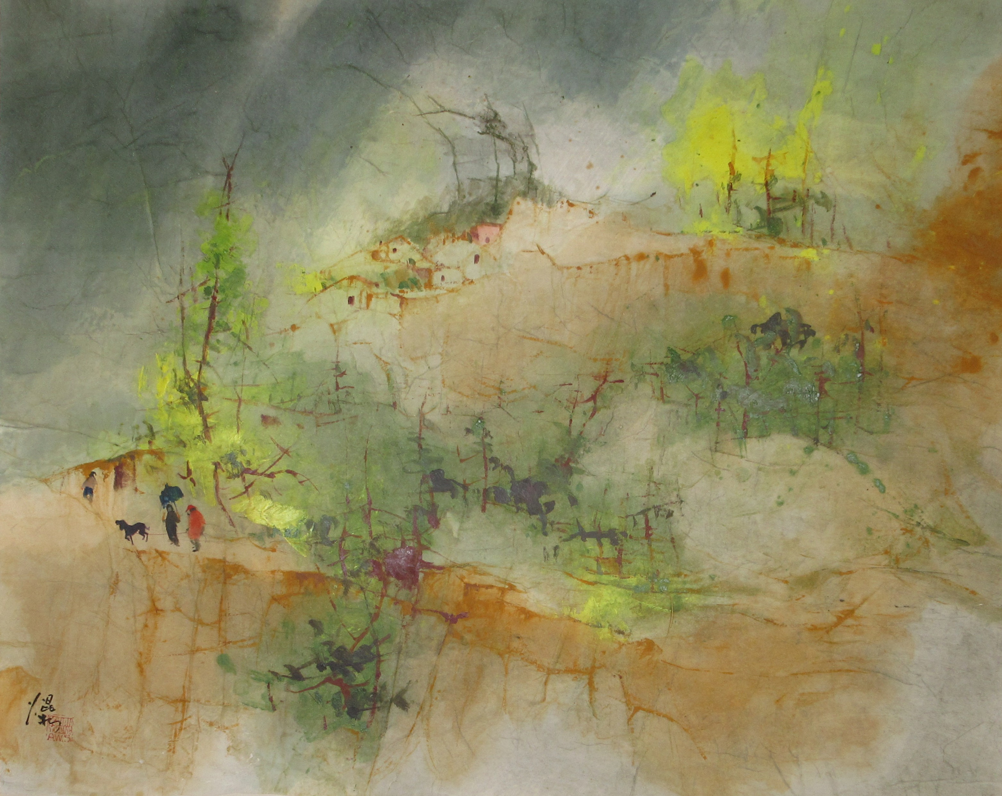 Three people with a dog on a trail. Buildings higher up in the distance. Mounted on watercolor paper, brown paper backing. The painting was in a rolled state will need to be pressed flat for framing.