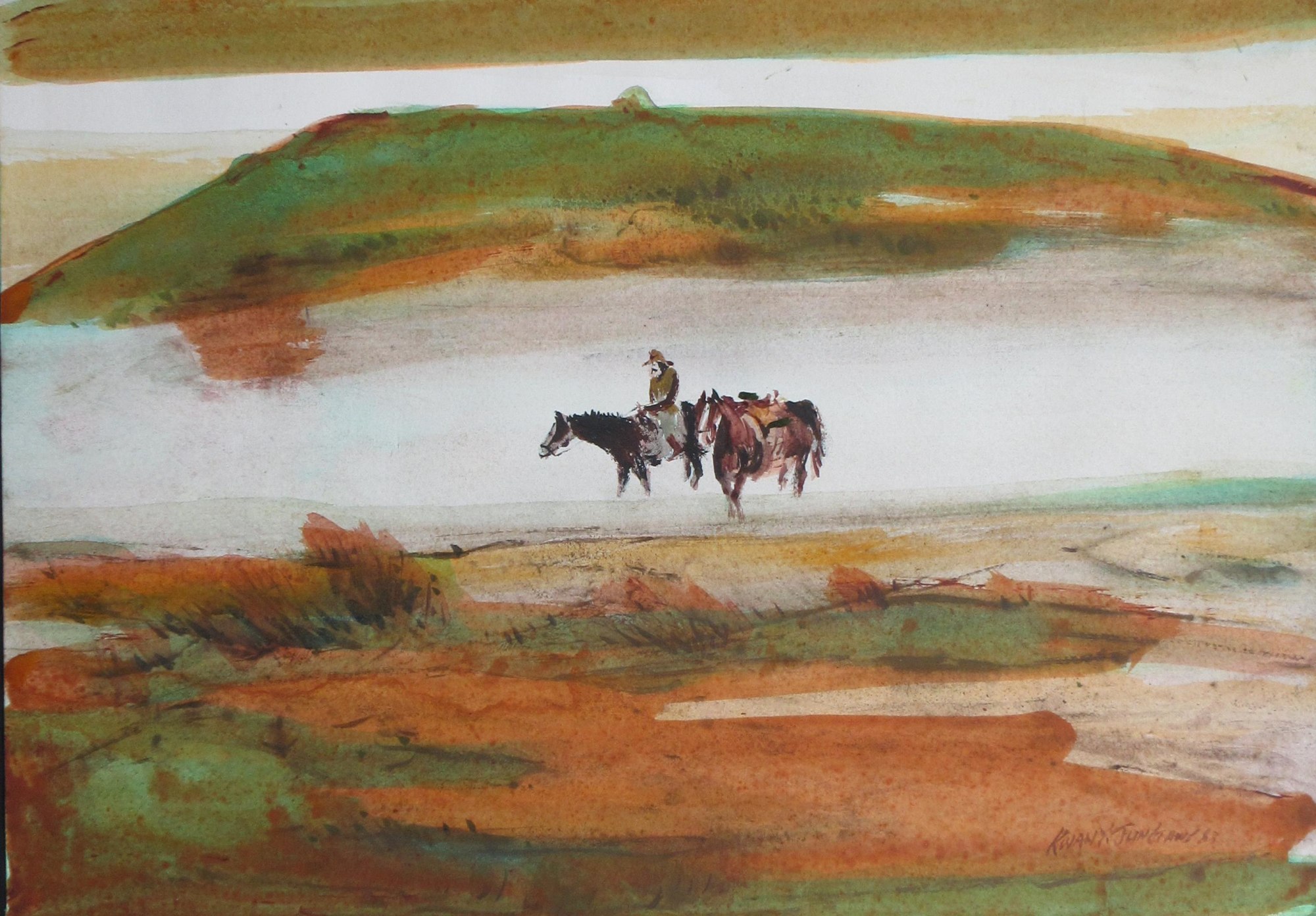 With a mesa in the distance, a rider and pack horse follow the borderline between low brush and mist.