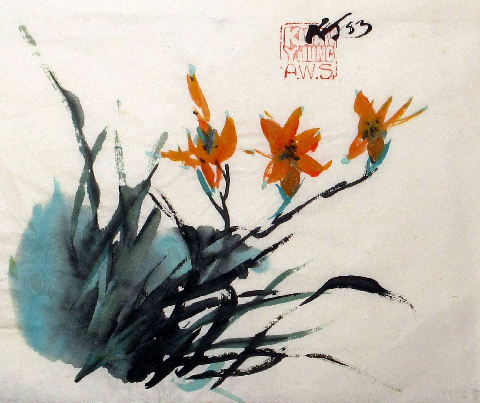 Orange orchids emerge from blue and black leaves. Unmounted.