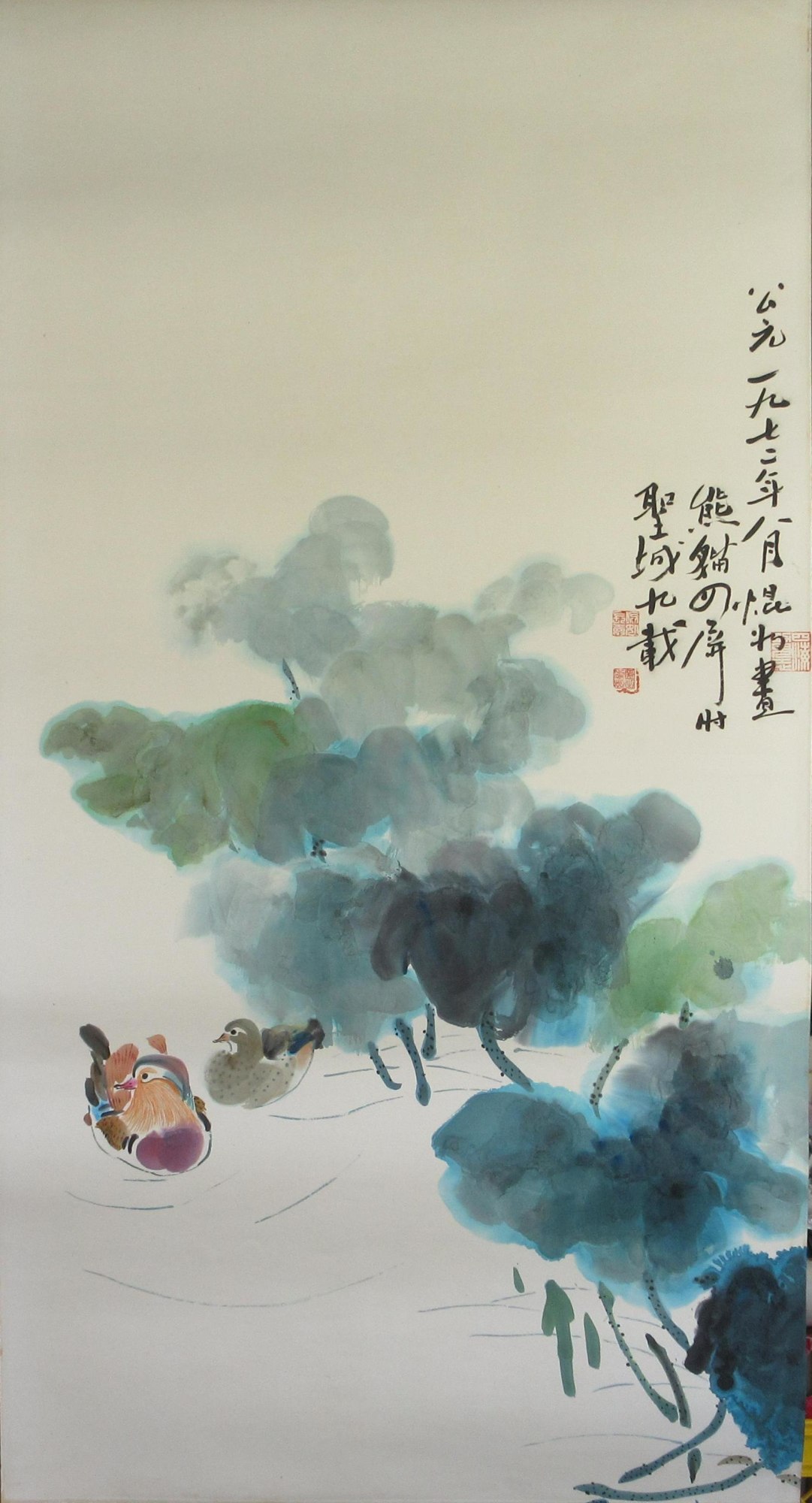 Two mandarin ducks swimming among lotus leaves. Mounted on paper with a brocade border on the top and bottom.