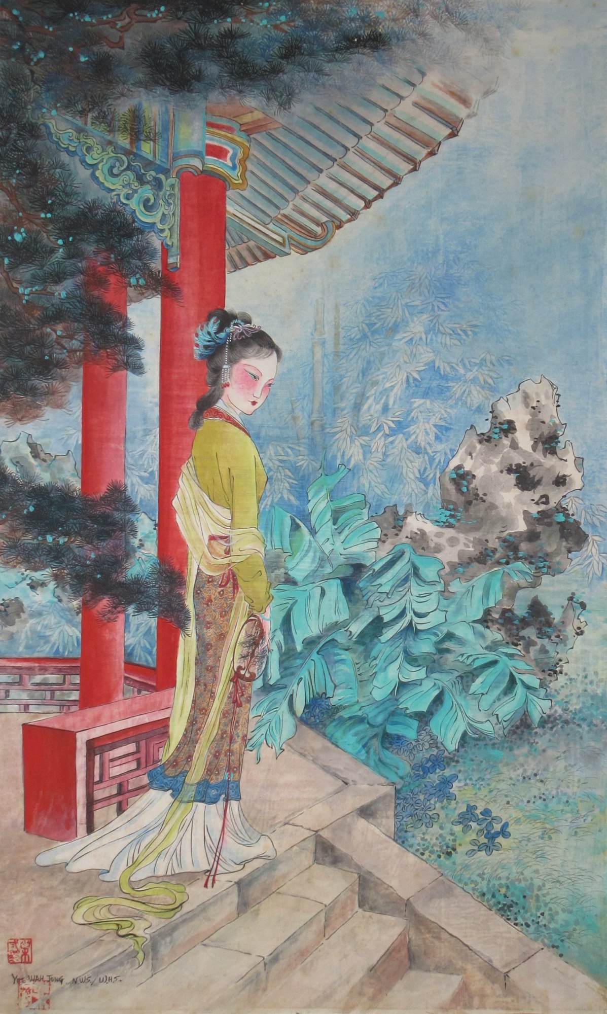 Mounted on watercolor paper. A painting of a Chinese lady wearing a gold, ornate gown standing on stone steps of a gazebo in a lush garden.