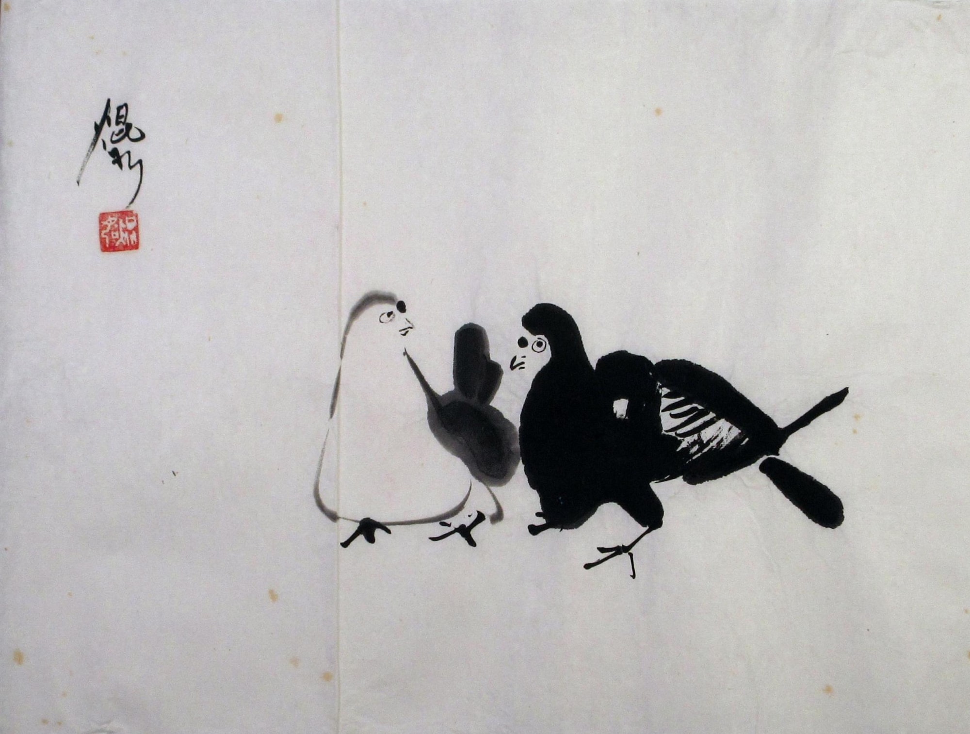 Two pigeons, one black, the other mostly white look at each other. Unmounted.