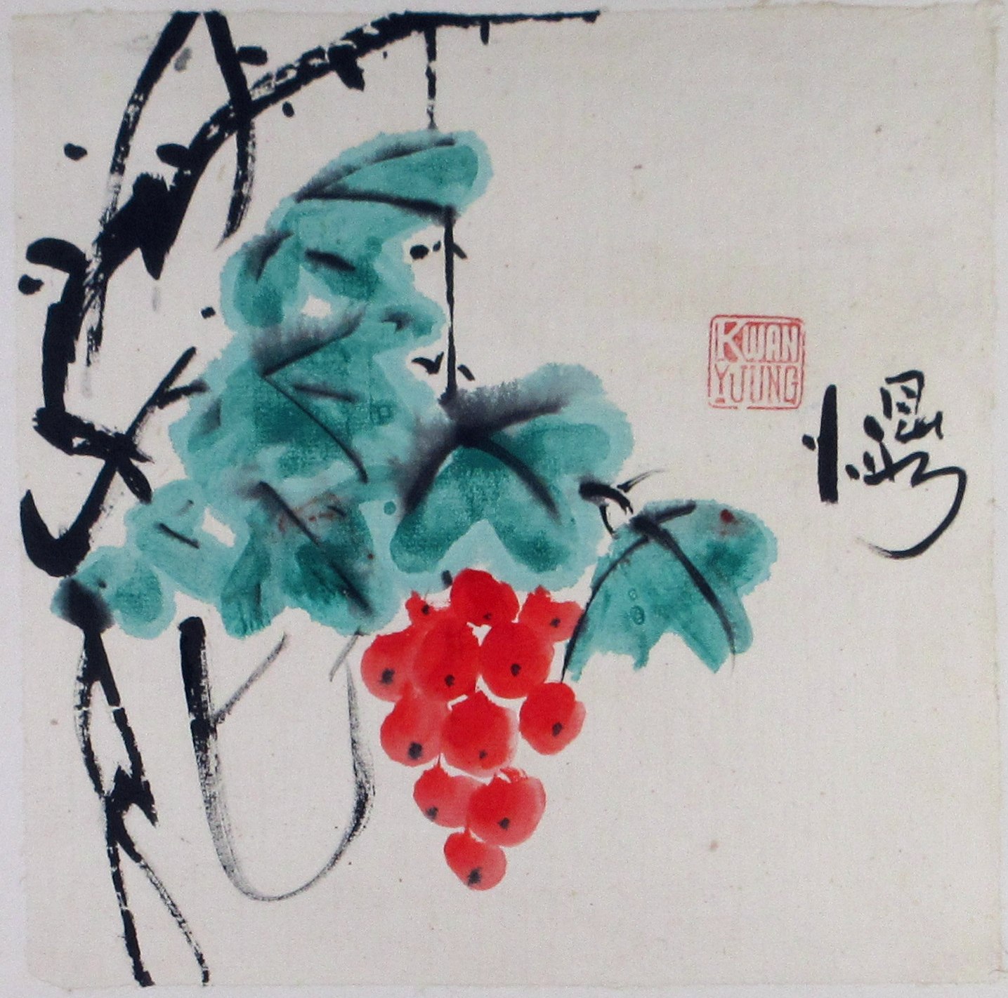 A painting of a cluster of red grapes, leaves and vines. Mounted on watercolor paper.
