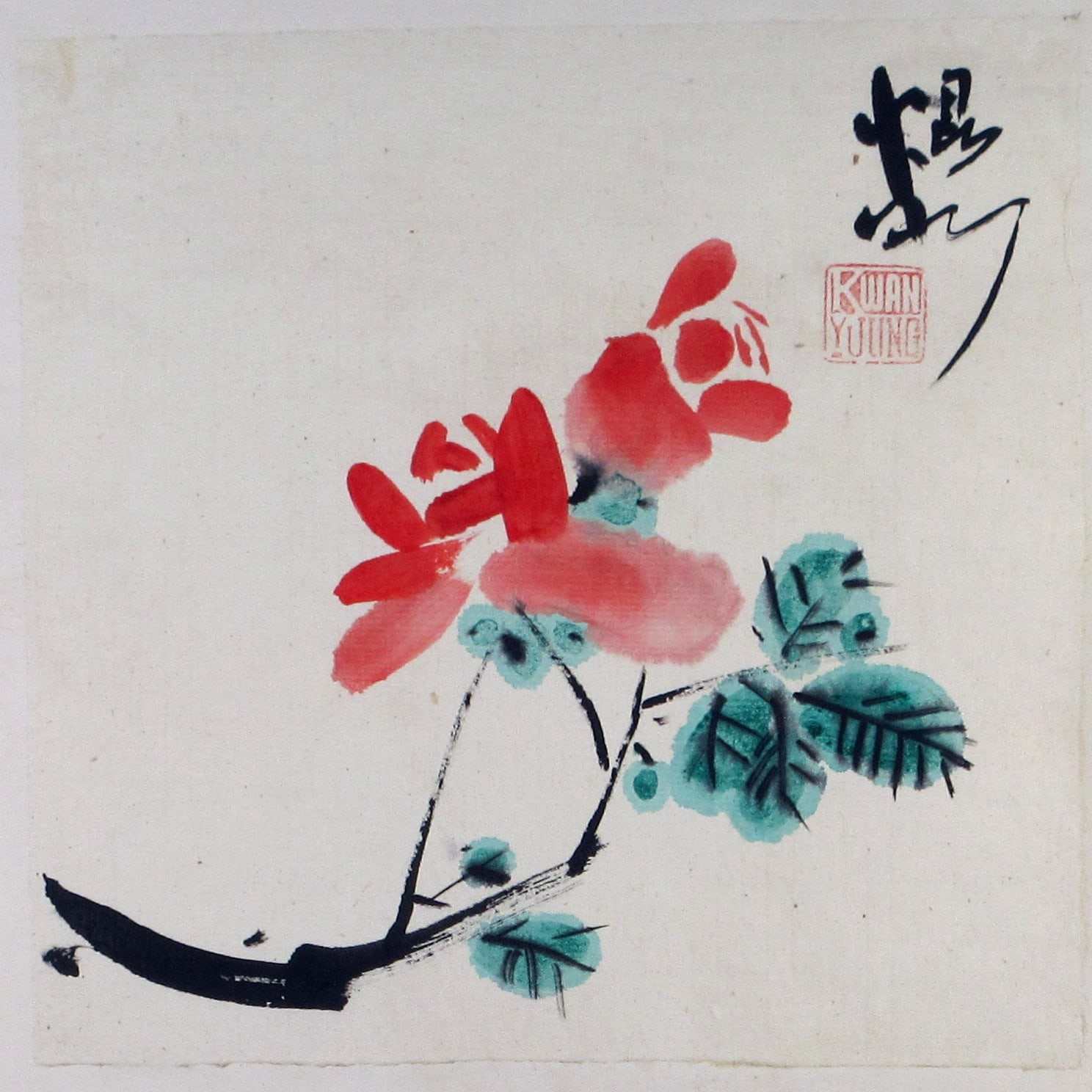 A painting of red-orange roses, with green leaves and black stem. Mounted on watercolor paper.