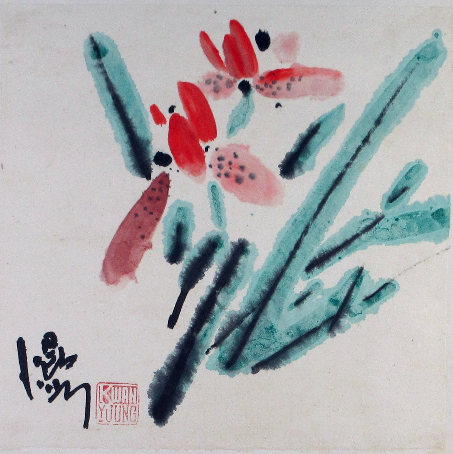 A painting of a clump of red and pink irises. Mounted on watercolor paper.