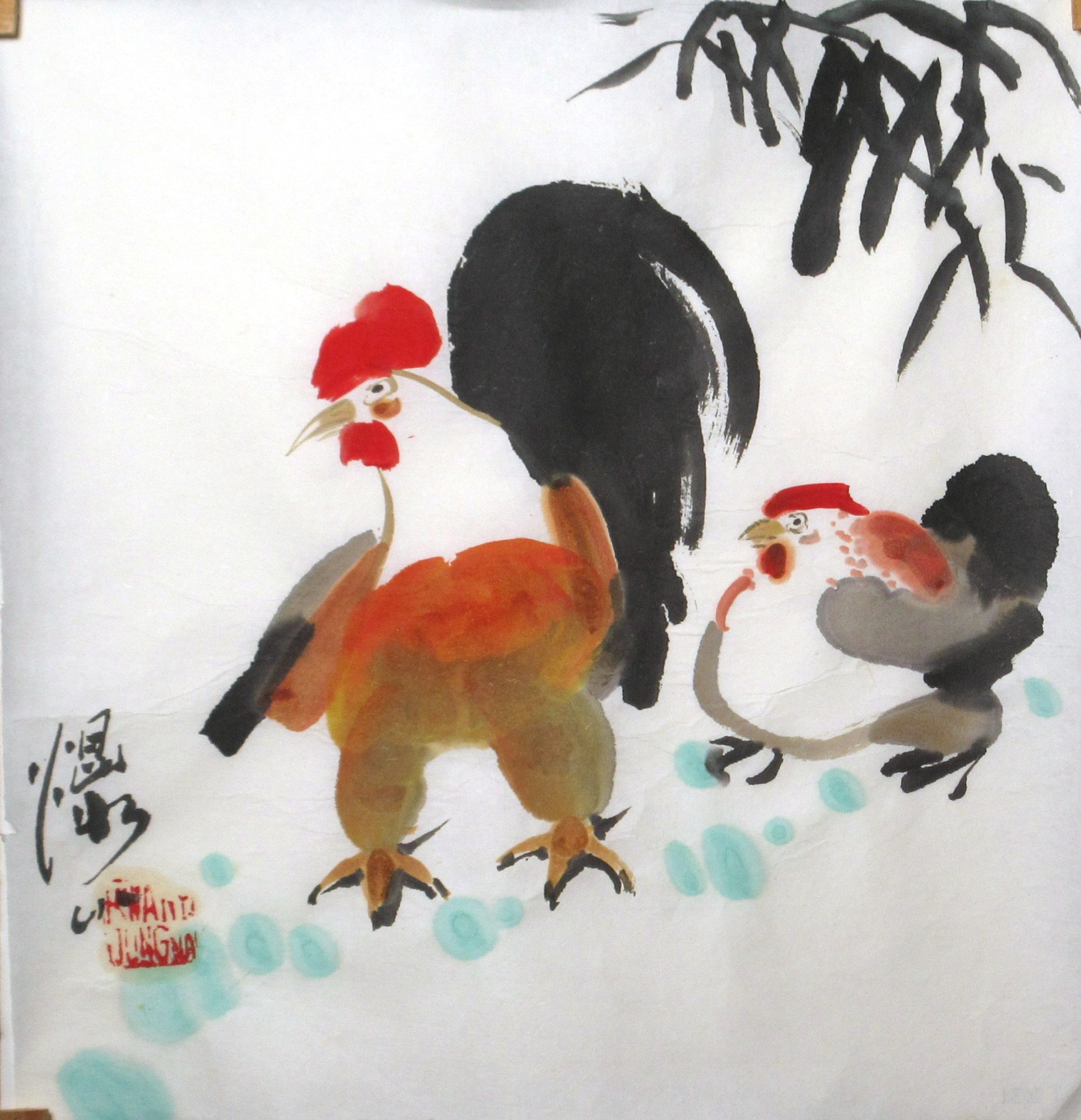 A hen and rooster underneath bamboo leaves. Unmounted.