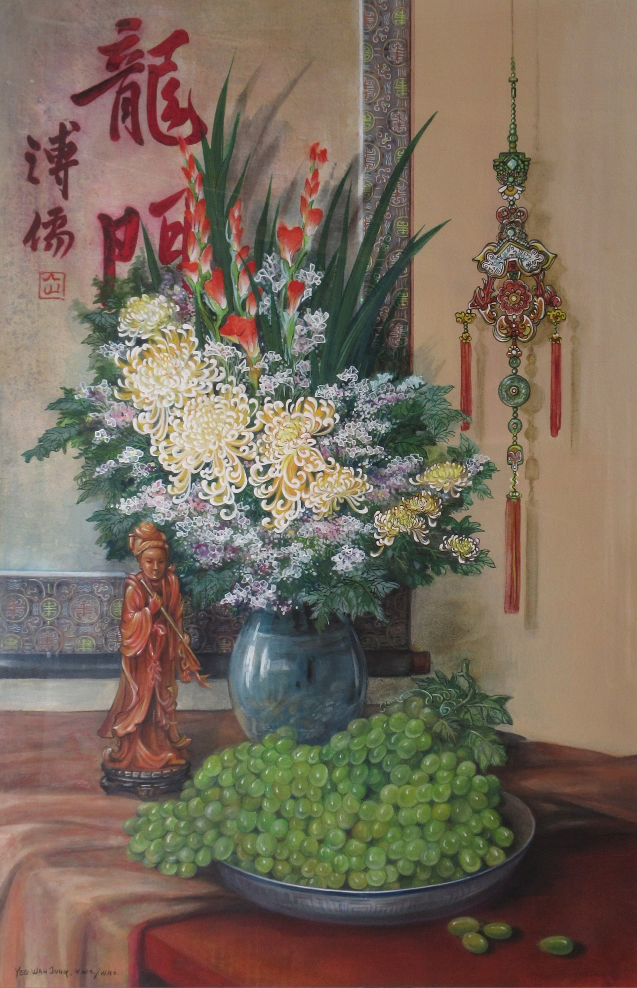 A bowl of green grapes, brown hard-stone figurine, chrysanthemums & gladiolas in a blue glazed vase set before a calligraphy hanging and wall ornament. Matted and in a white an mauve wooden frame.