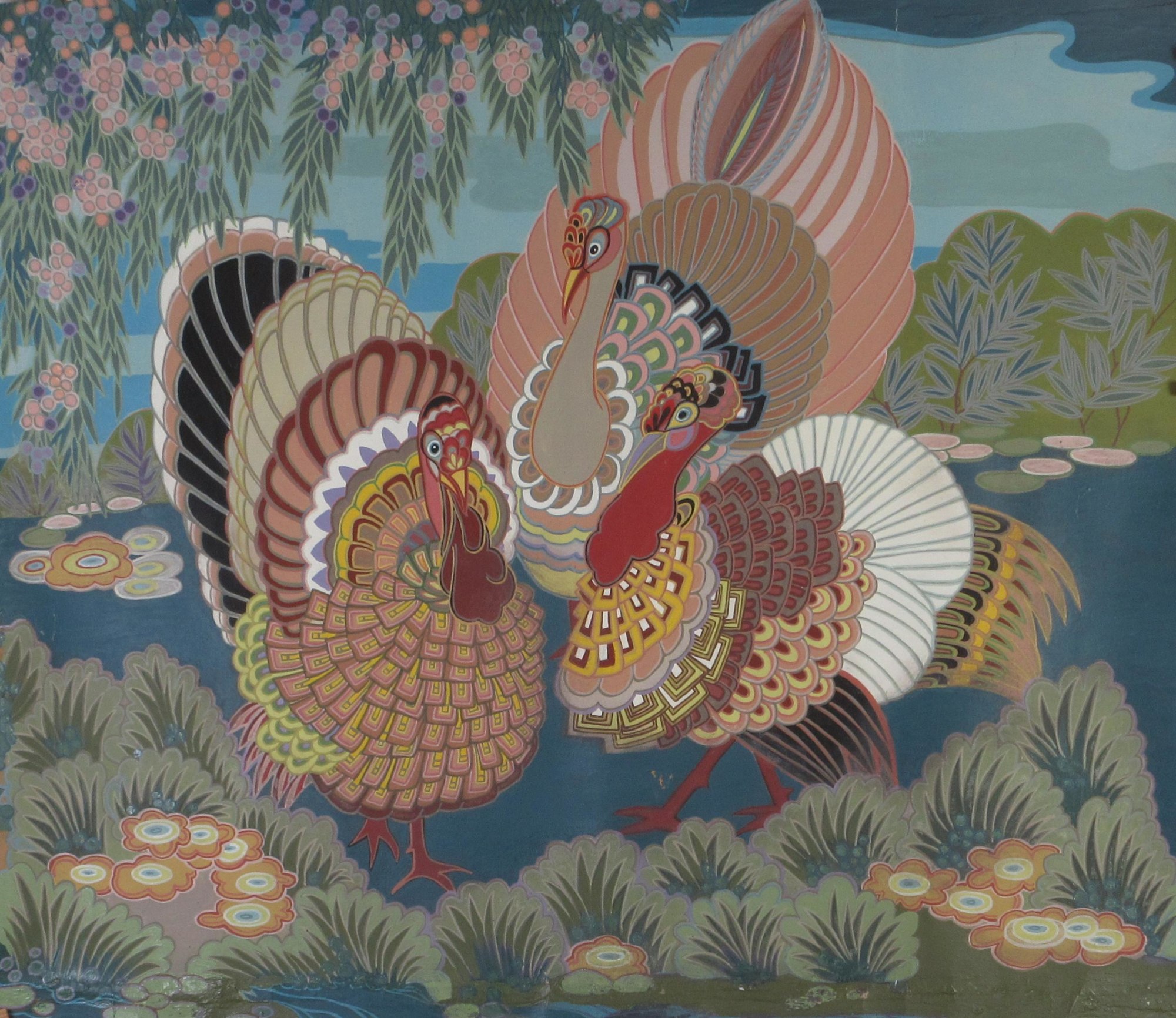 A tu-aunqua piece showing three tom turkeys under a willow tree among stylized plants and flowers.