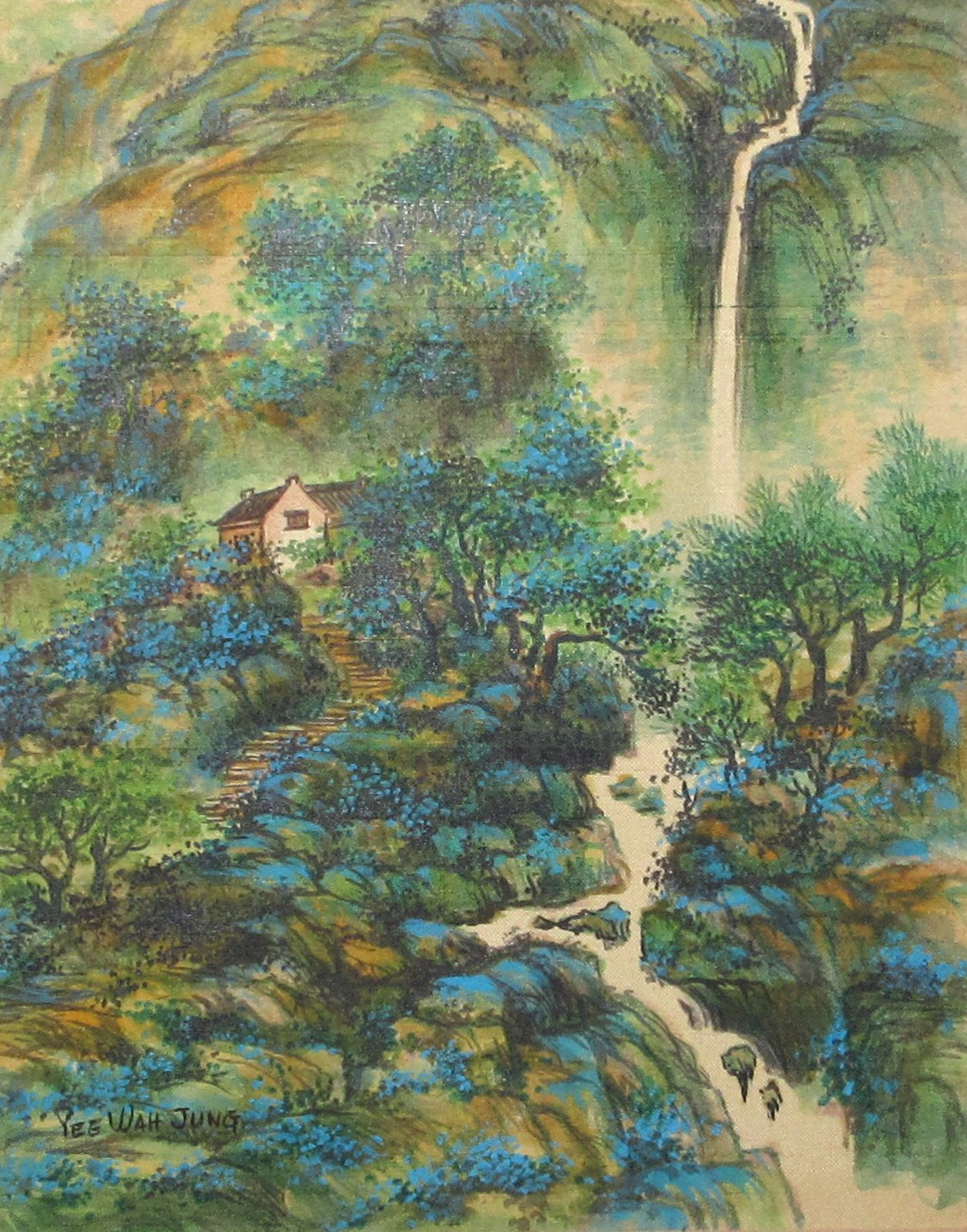 A painting of a house in dense trees with teal blue stones and trees near a waterfall and stream. In a mat board frame.