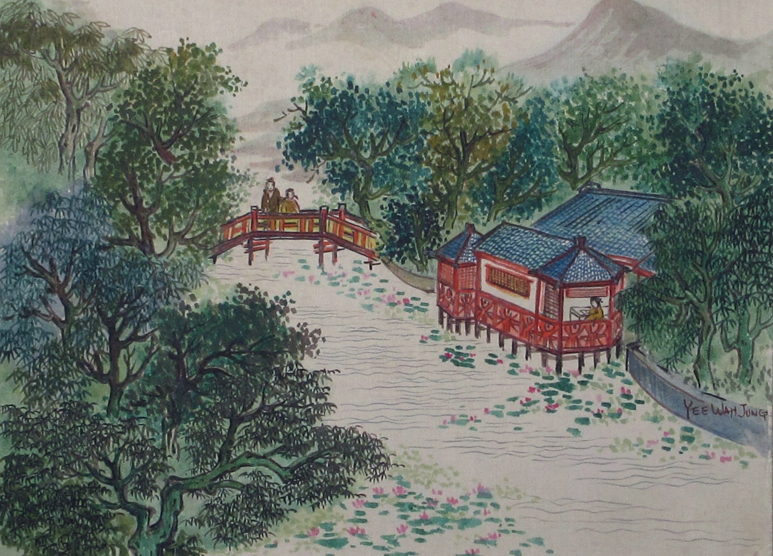 A small painting of a house next to a riverbank, with a figure in the window and figures on a bridge. Matted.