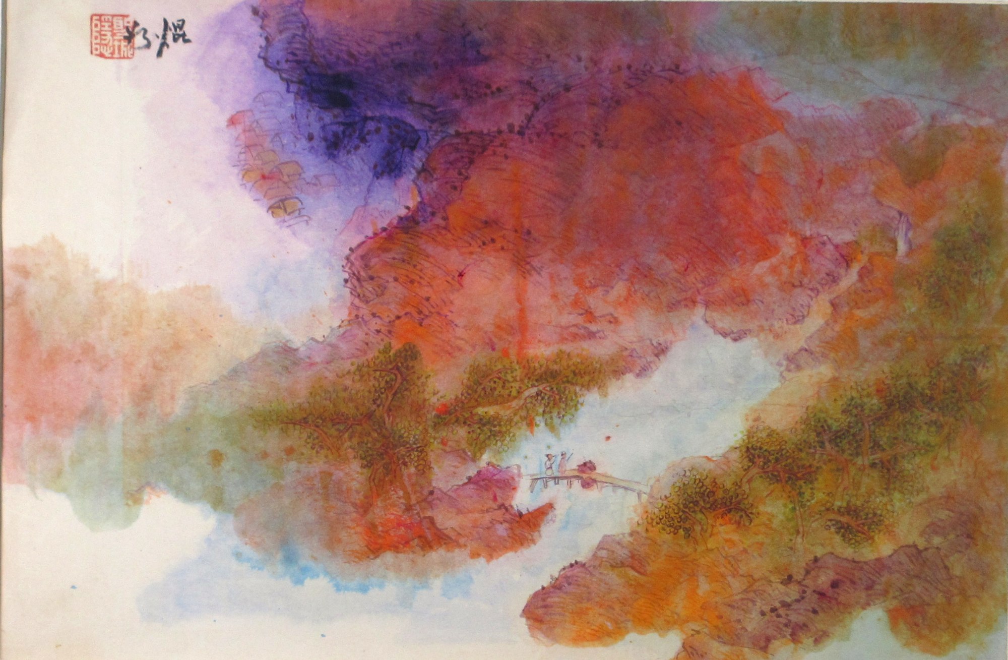 Two figures sit on a bridge, fishing, with a small settlement in the purple distance. Mounted on watercolor paper with a brown paper backing. Unframed.