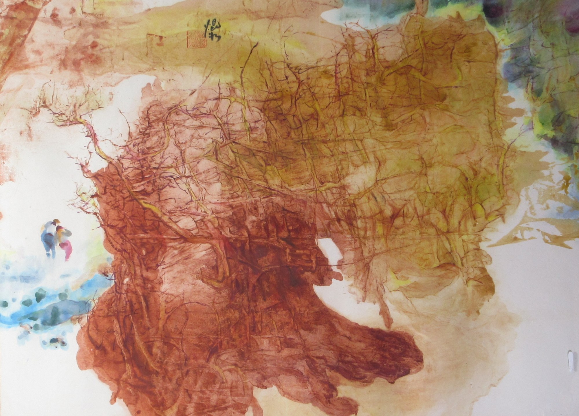 A matted and framed abstract painting of two figures wading in water near a forest. The frame is wood painted an antique gold.
