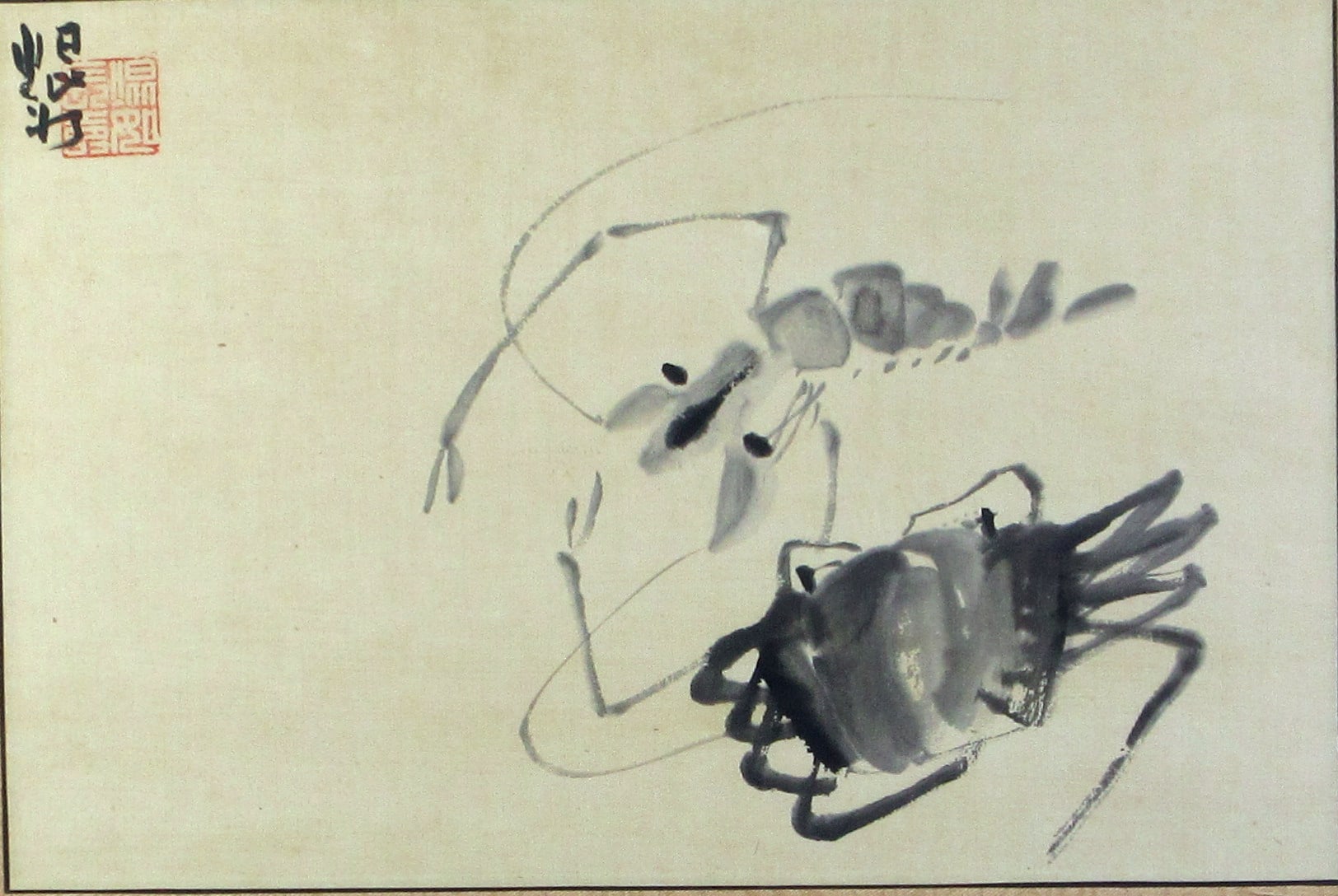 A painting of a prawn and crab, mounted on paper with a brocade border. In a wooden bamboo style frame with brass decorative hangers.