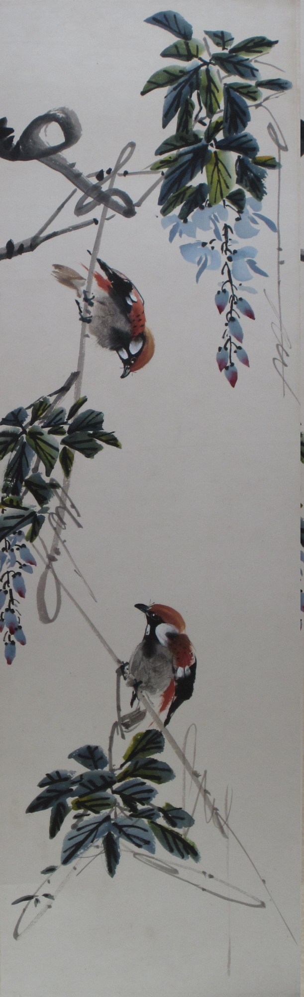 Two birds, one looking down on the other, among blooms and branches. Mounted on paper with a brocade border.