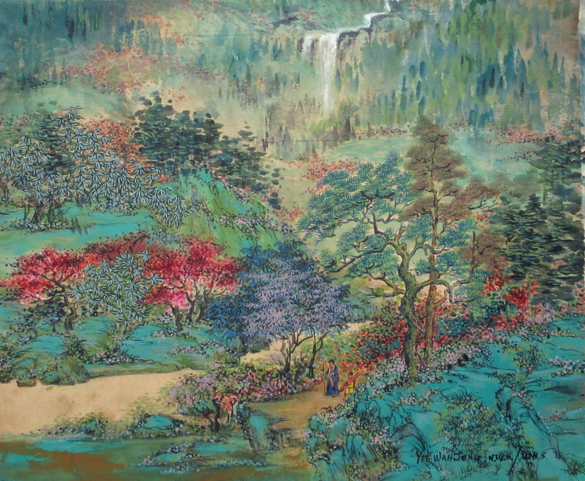 A painting with showing colorful trees, figures on a walking path in a lush turquoise and teal landscape. Mounted on water color paper.