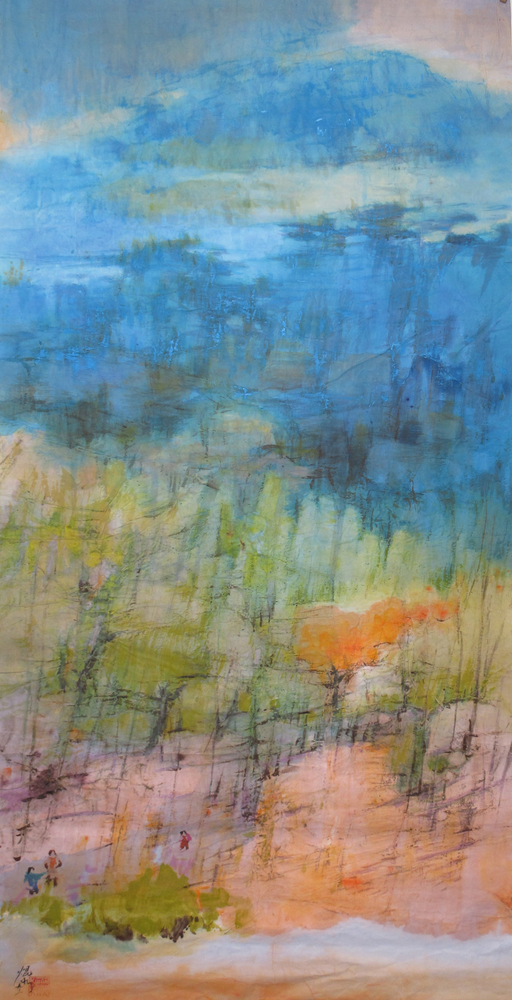 Three figures on the trail in this vertical landscape. Unmounted rice paper. Goes with #2204 and #2203.