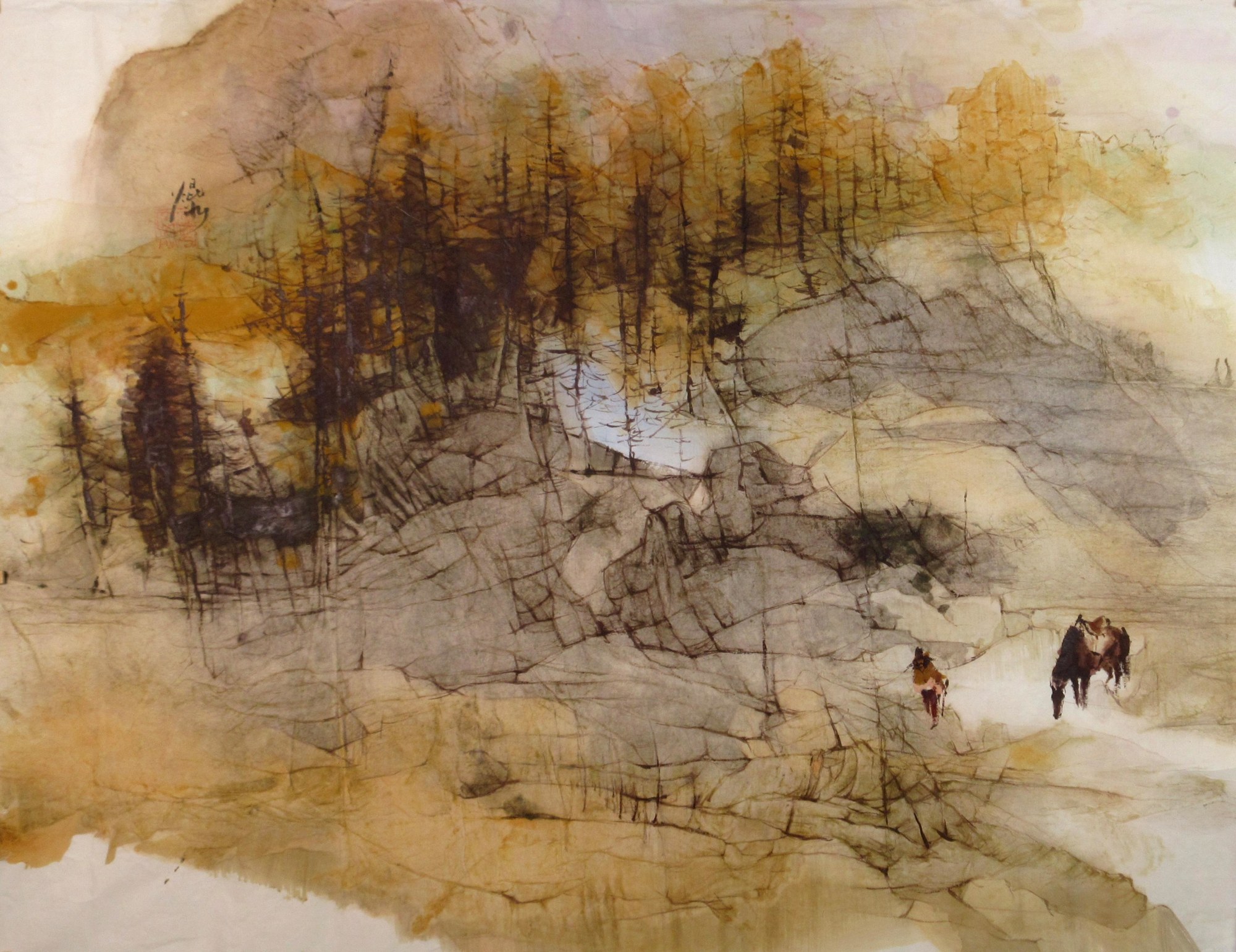 A rider steps into the brush while his horse drinks from a stream. Unmounted linen paper.