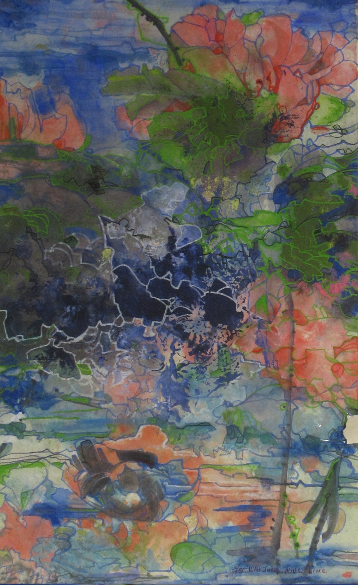 An abstract mosaic like painting of water lilies. Matted in white and in a gold color frame.