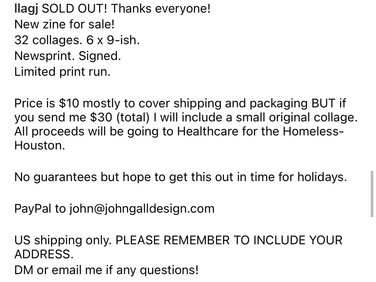 Special Consideration: This collage zine was made to raise fund for Healthcare for the Homeless in Houston, Texas, USA. For a detailed interview on this artist see: https://thegreatdiscontent.com/interview/john-gall/