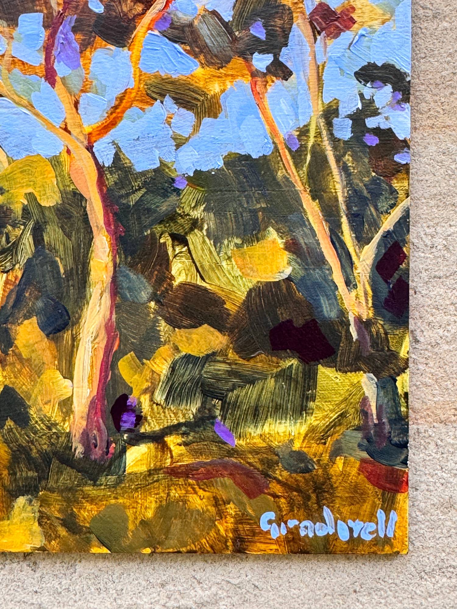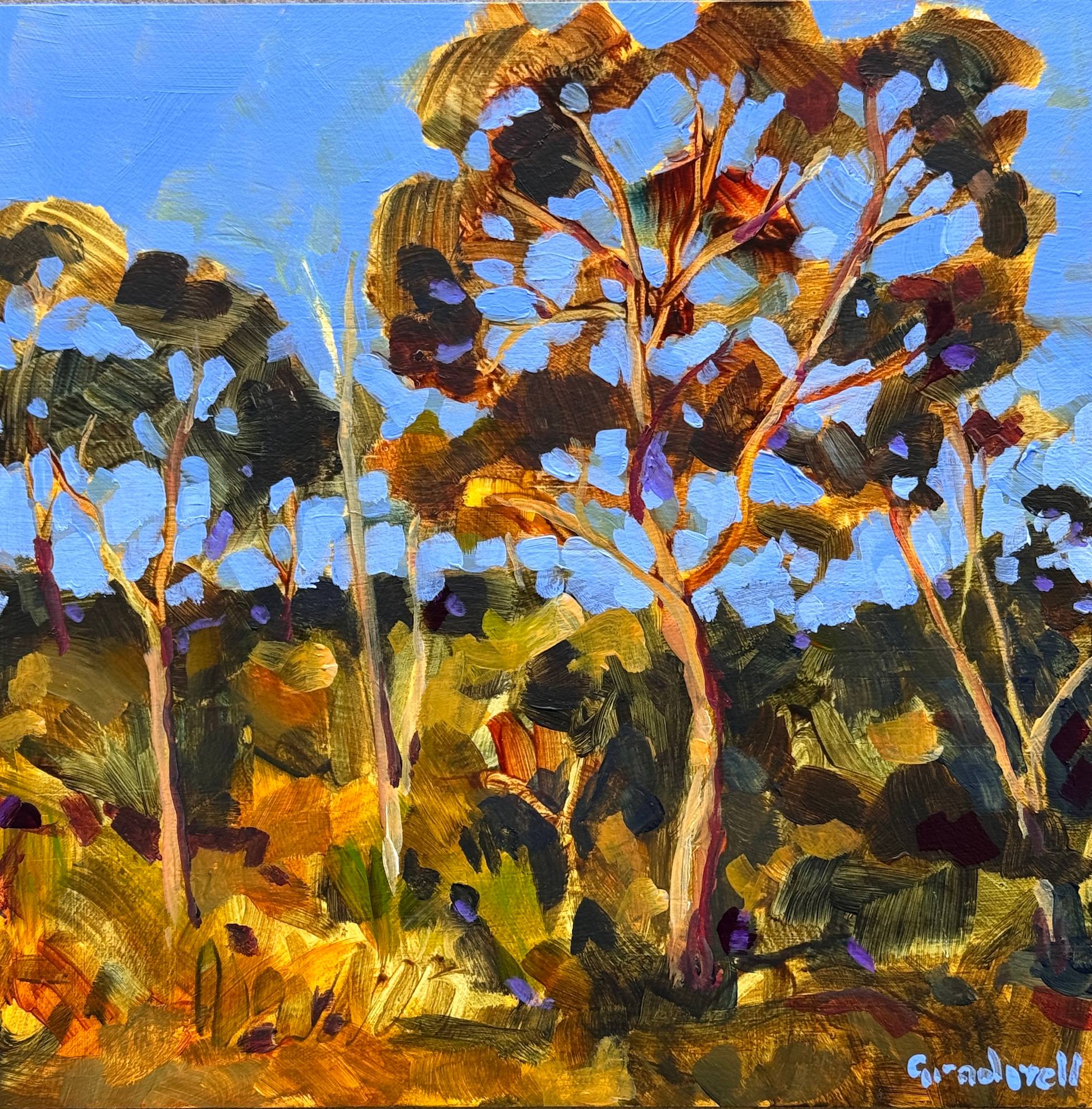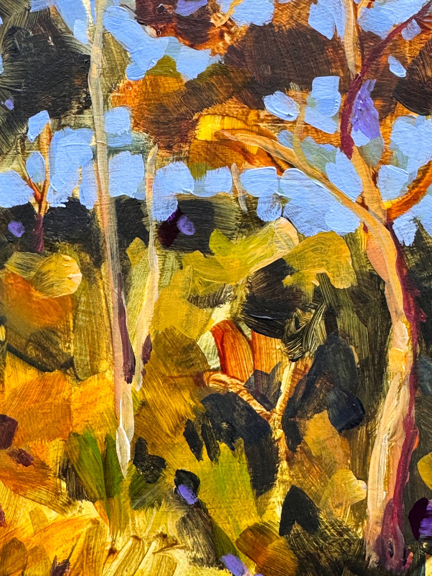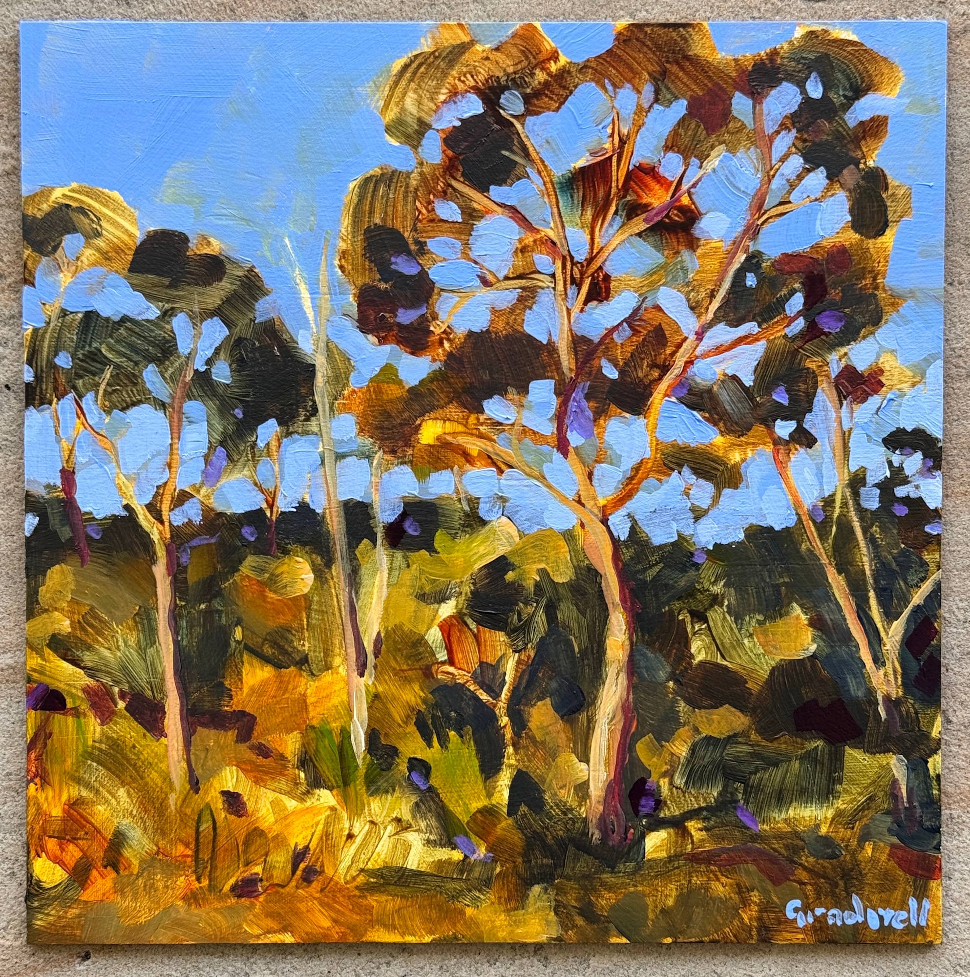 Glorious end of day light on trees by the side of the road. Painted in loose colourful brush strokes