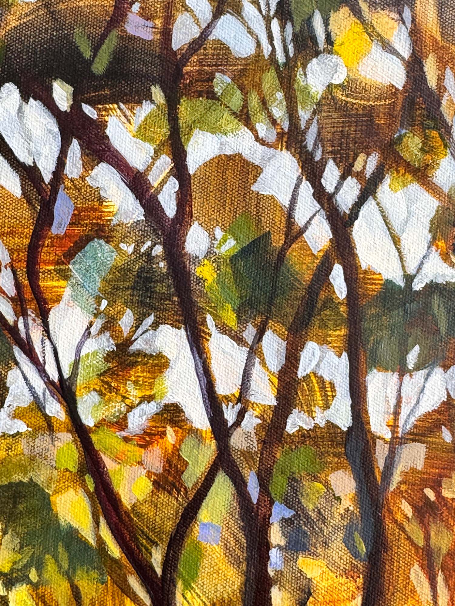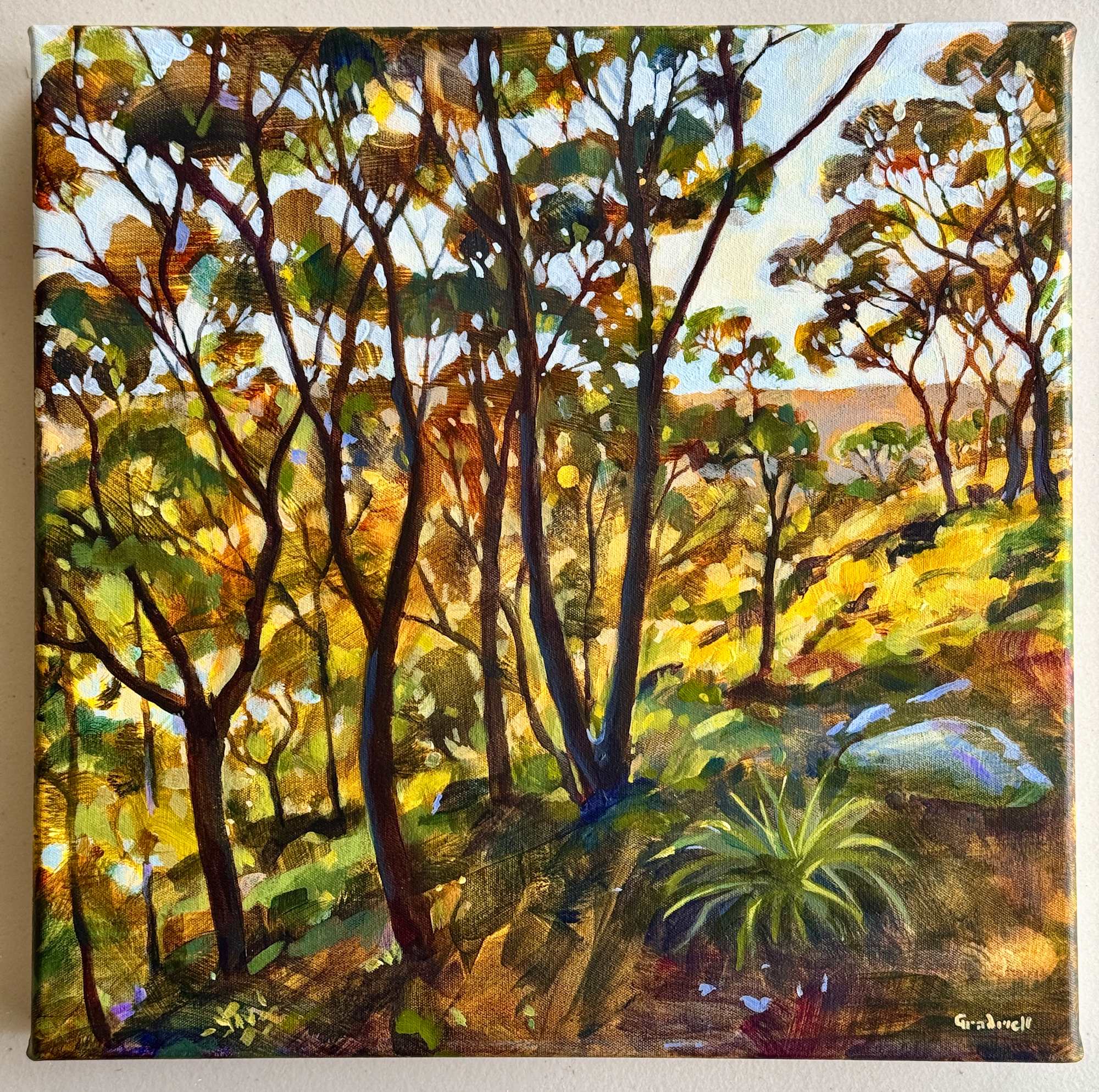 This painting is inspired by local bushland in Sydney looking out through the trees westward towards the setting sun. There is such a clarity of light and vividness of colour at this time of day and I’ve tried to capture this. It’s a small joyful painting that would brighten up any corner of your home