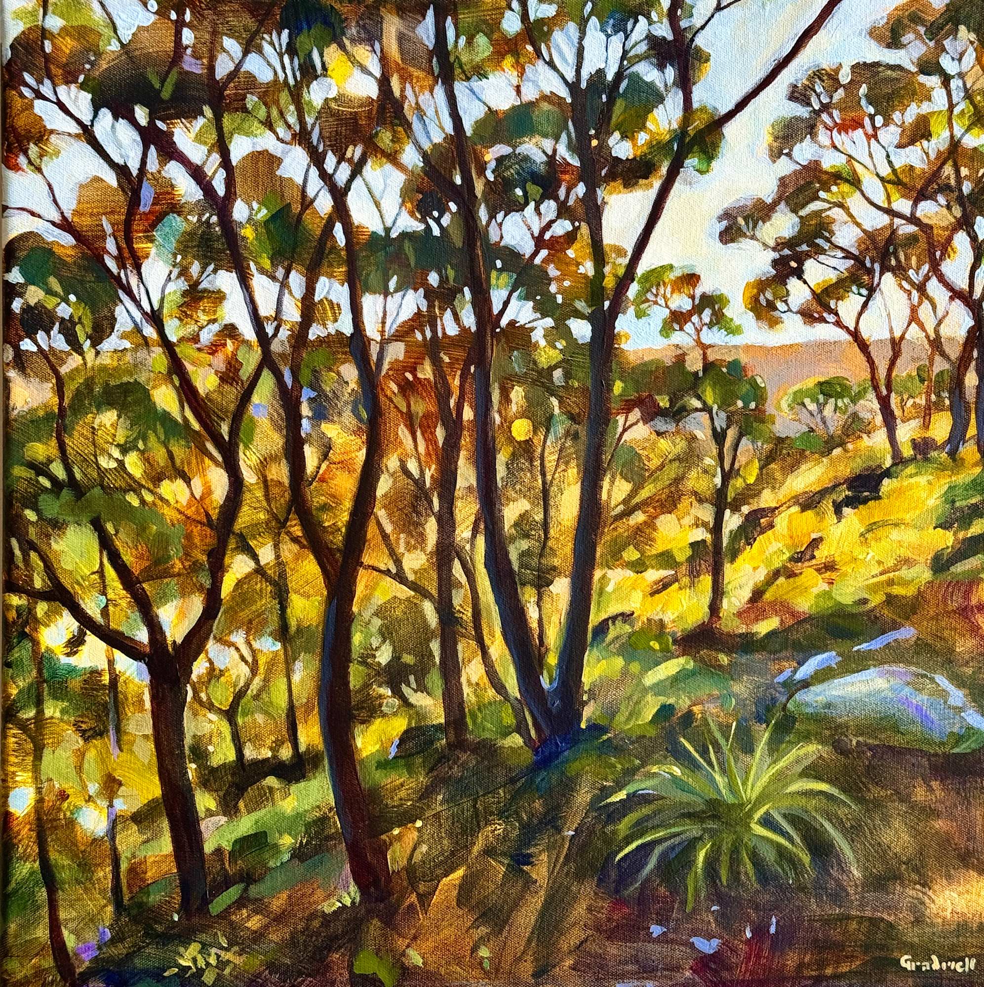This painting is inspired by local bushland in Sydney looking out through the trees westward towards the setting sun. There is such a clarity of light and vividness of colour at this time of day and I’ve tried to capture this. It’s a small joyful painting that would brighten up any corner of your home
