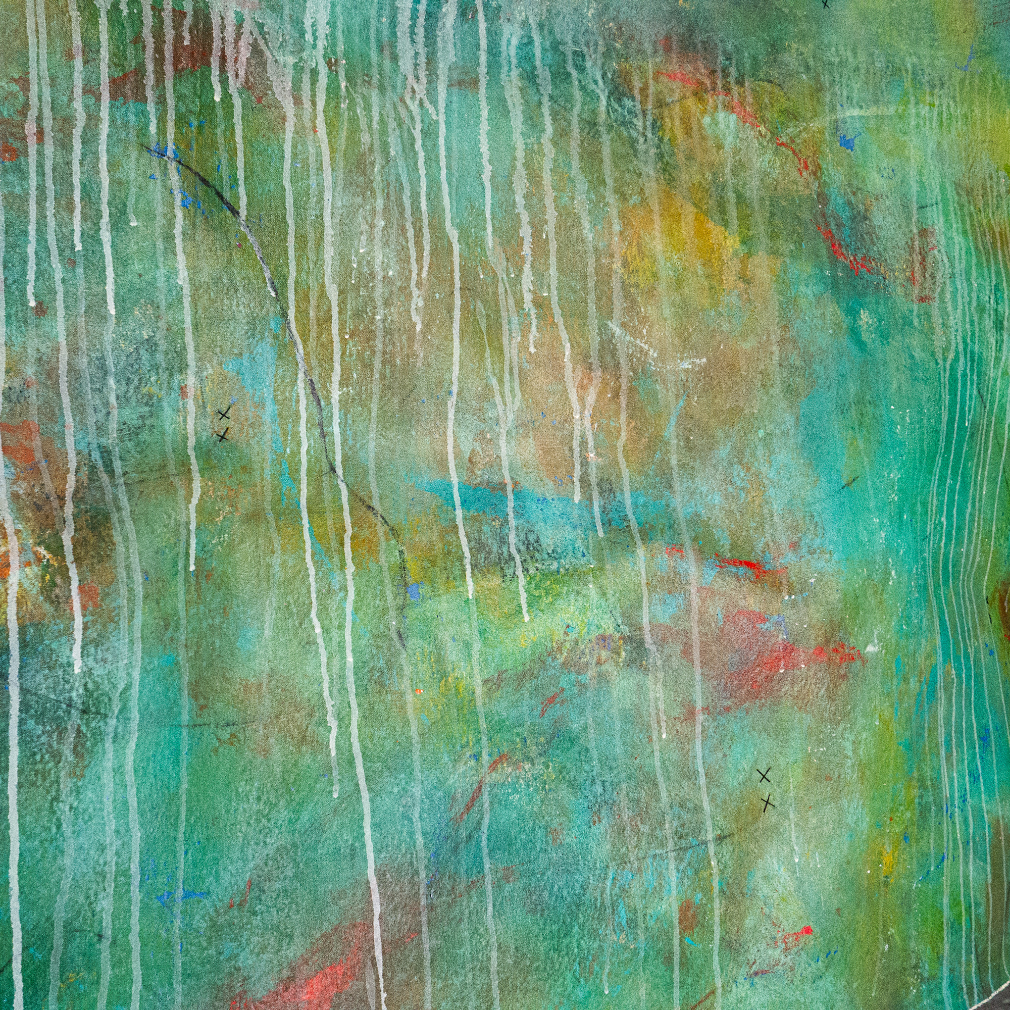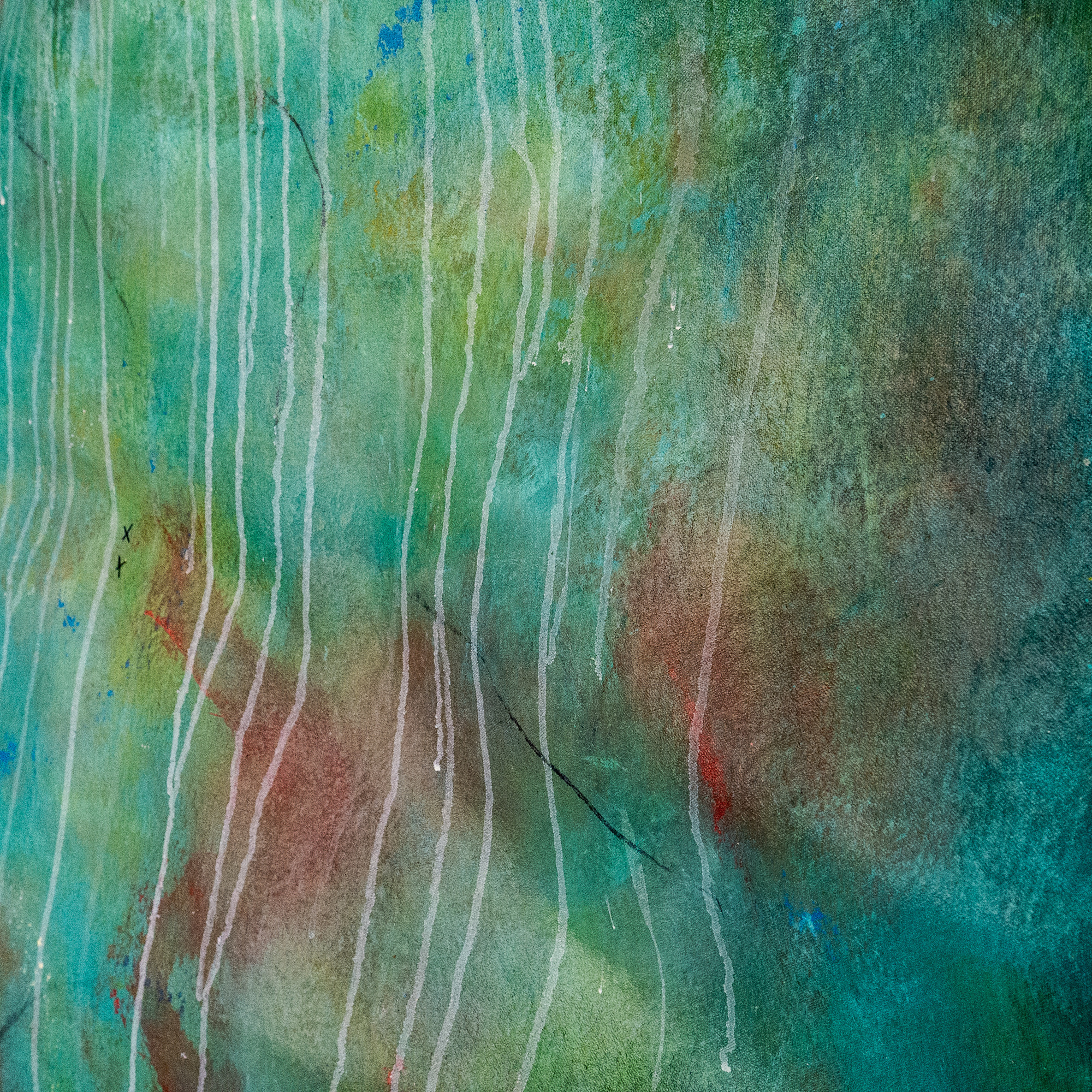 FLOATING INDEFINITELY is an acrylic painting laid on a floating canvas. The canvas frame is constructed with chicken wire.