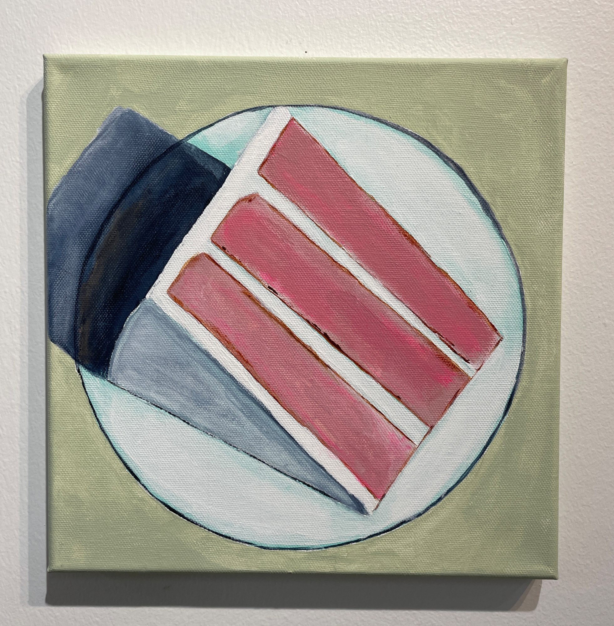 The Homemade Sin series is nostalgic and inspired by two artists, Wayne Thiebaud - an American painter known for his colorful works depicting commonplace objects who used heavy pigment and exaggerated colors to depict his subjects, and the well-defined shadows characteristic of advertisements, and Mossy Ligon - my mom who had a dessert business, Homemade Sin, where she made desserts for Houston-area restaurants. Strawberry Shortcake is acrylic on a 10" x 10" canvas and framed in a floating frame.
