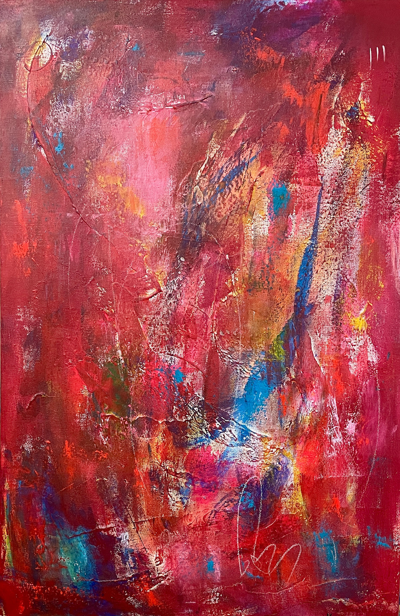 Positive Perspective is full of joy, movement, and color. This is a vibrant painting on a custom-built canvas, sized at 36" x 24" x 2".