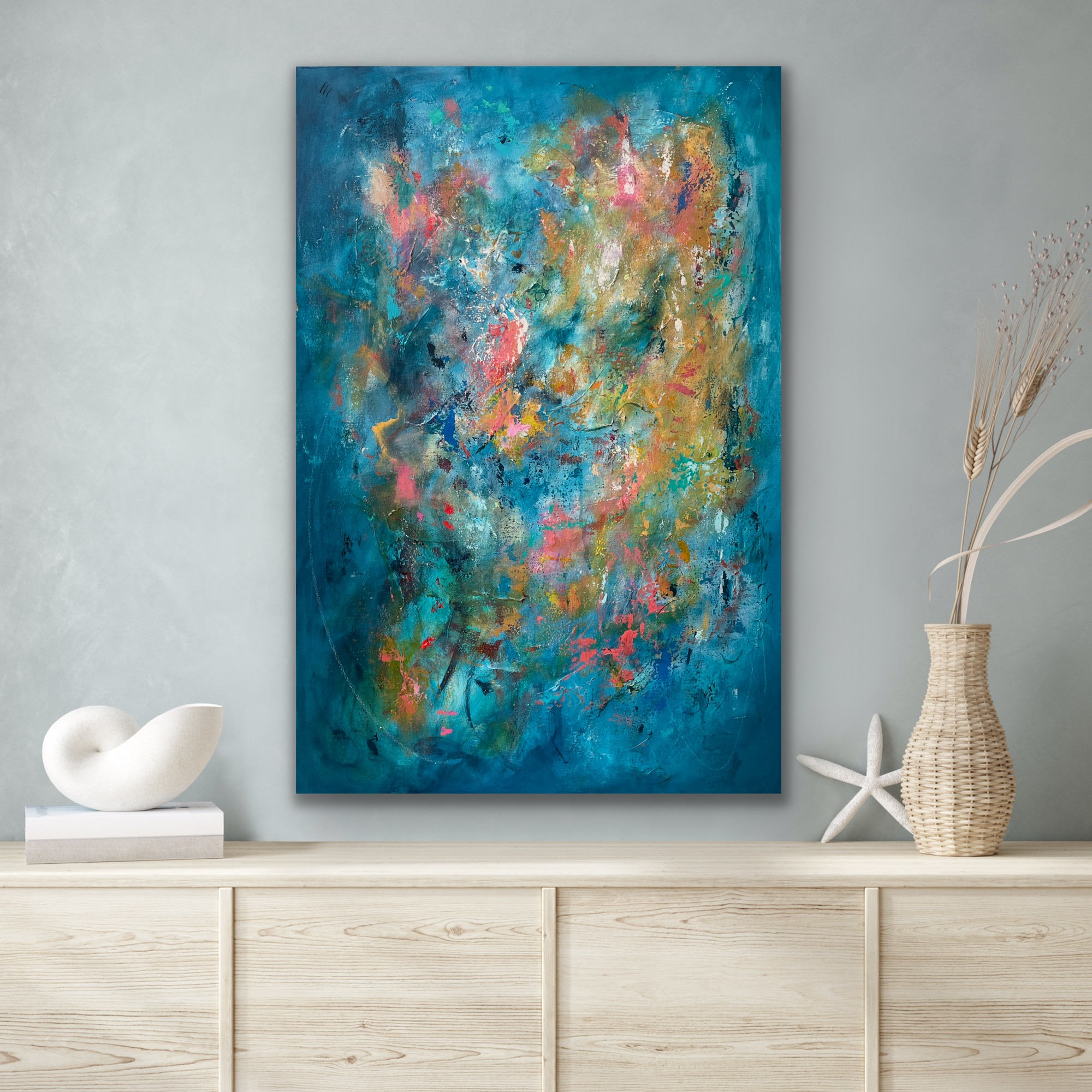 In Between Dreams is lively absract painting that colorful and vibrant. The painting is acrylic on a 36" x 24" x 2" canvas.