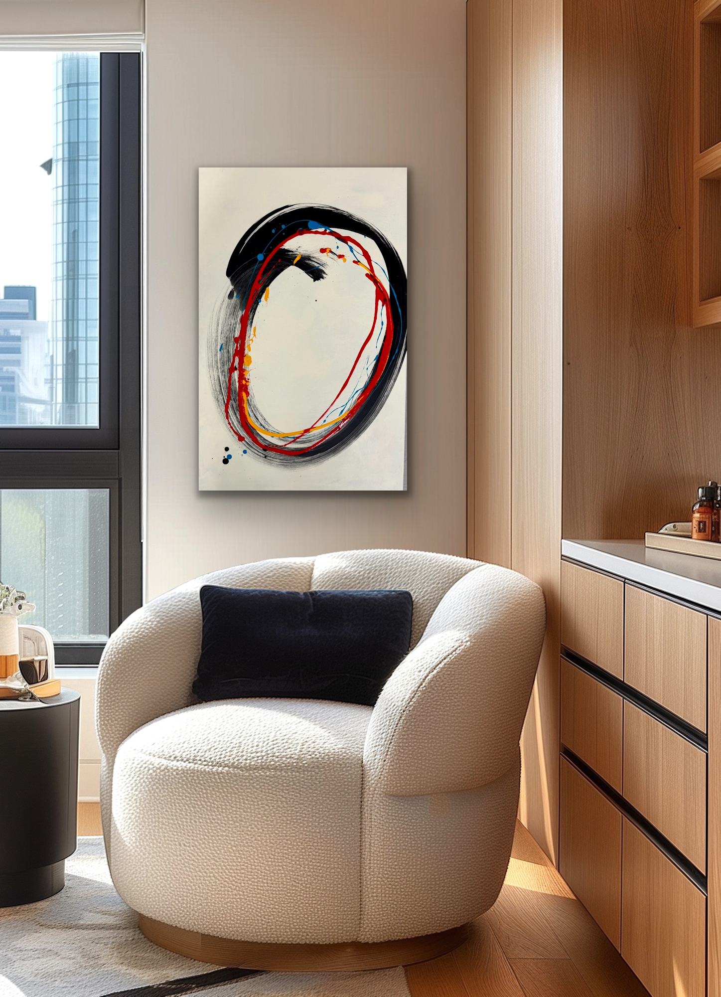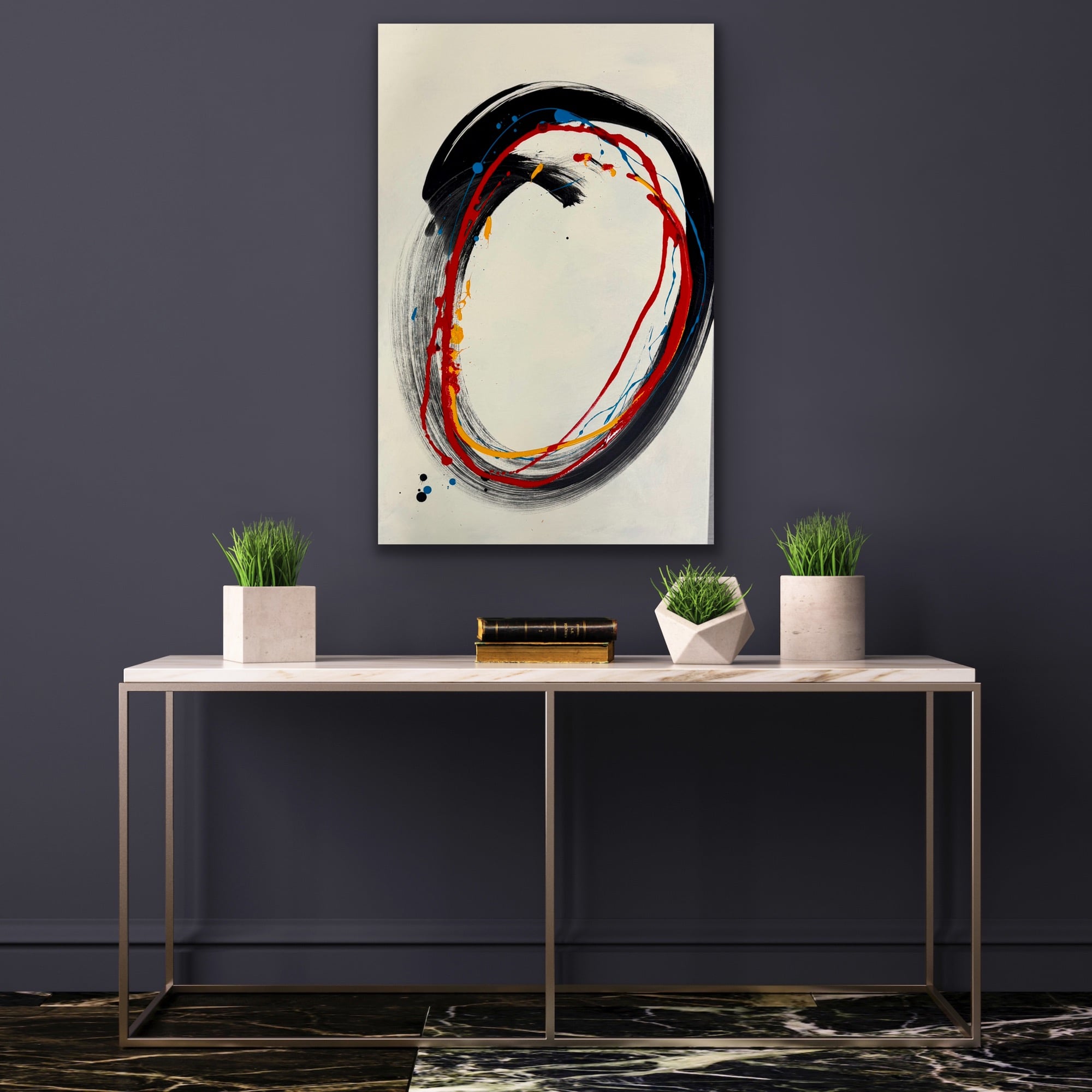 The acrylic painting is 36" x 24", sitting in an aluminum black floating frame.