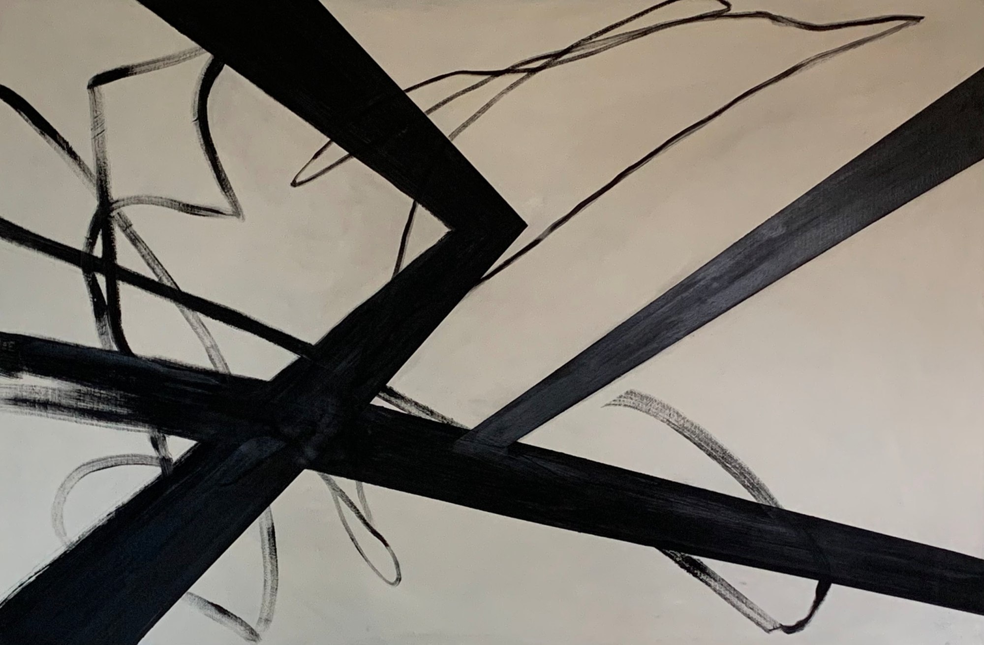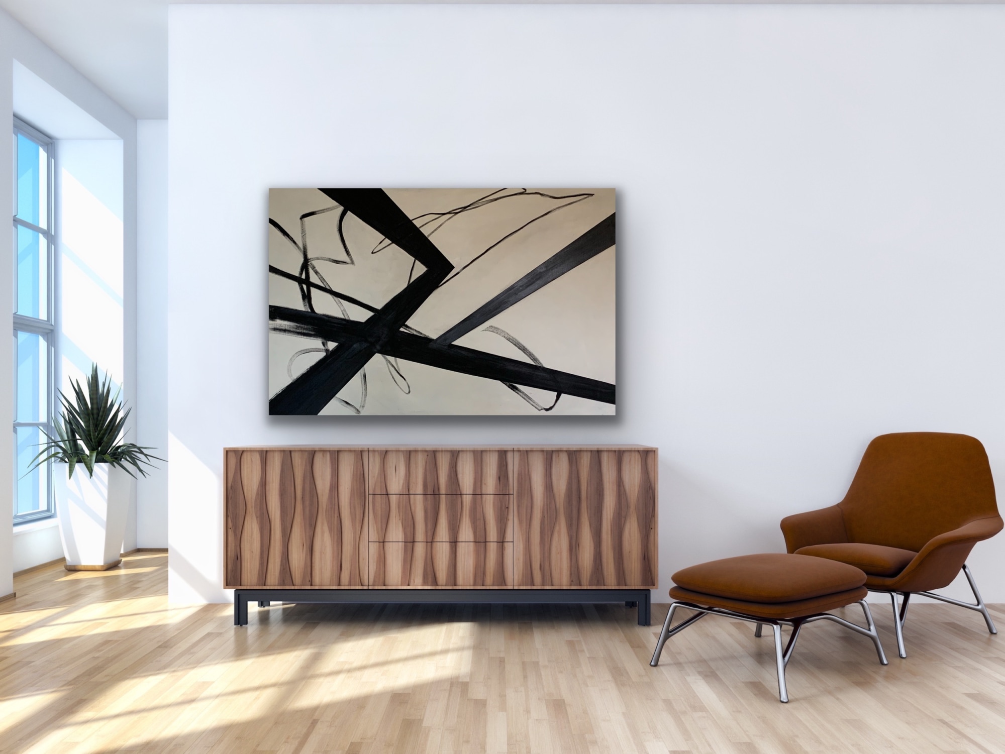 Capturing a bold yet minimalist style with its dominant use of black and white, this composition features captivating straight black lines that are a dynamic contrast to the expressive thin lines in the background adding depth and movement. Displayed in any home, gallery, or office this painting will surely be a conversation starter, leaving a lasting visual impression upon all who see it.