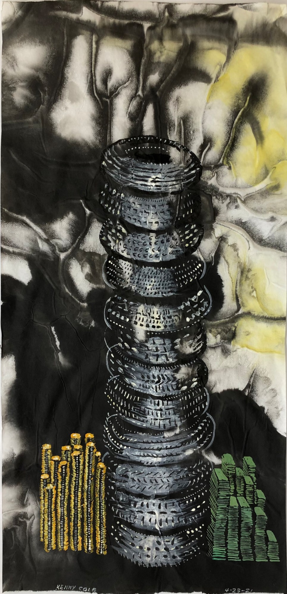 "Tower of Power"  Image: Stack of tires, coins and cash.