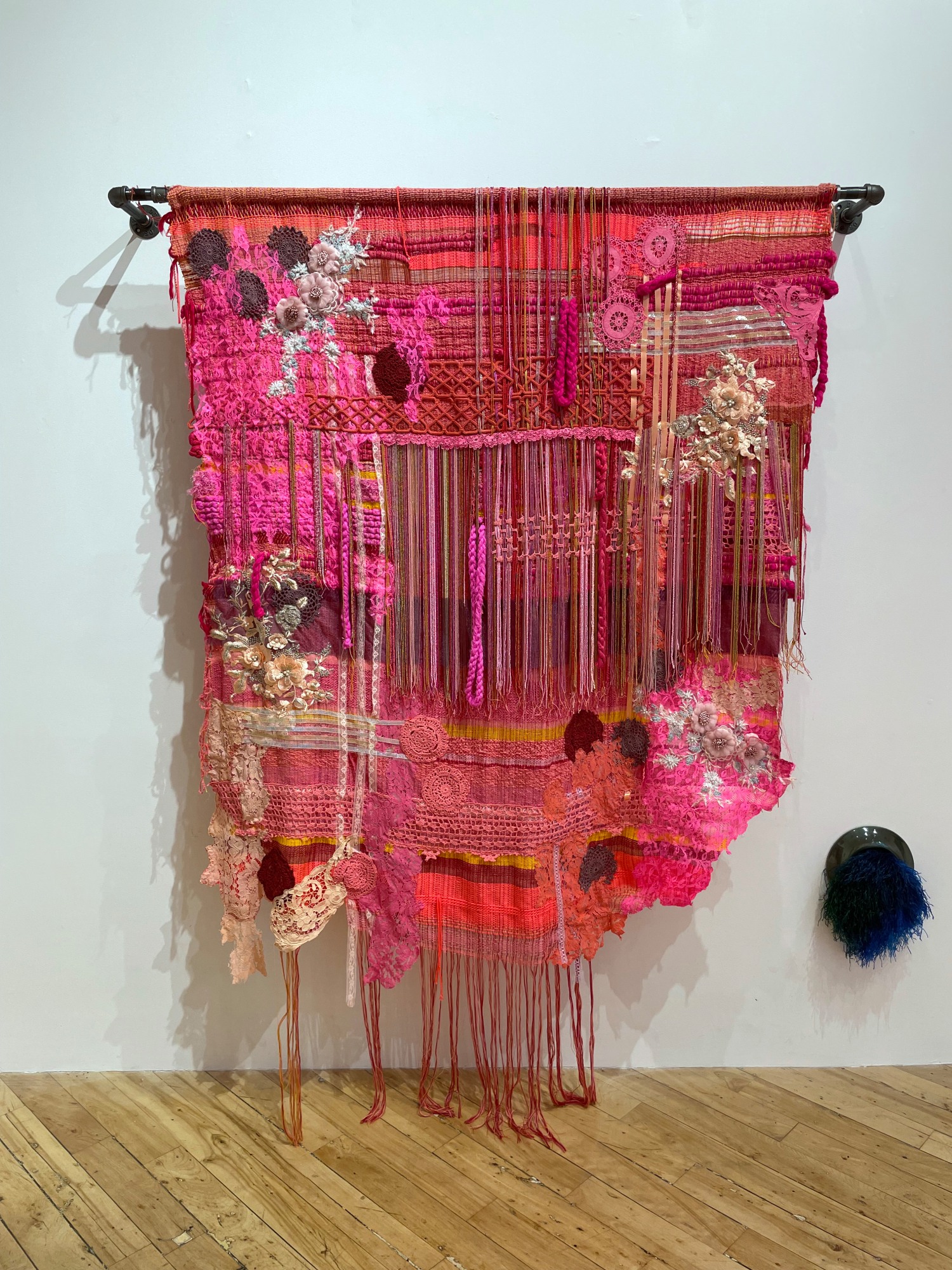 • Hand woven fabric, trim, beads, repurposed appliques, salvaged crochet hand dyed lace pipe fittings/nipples