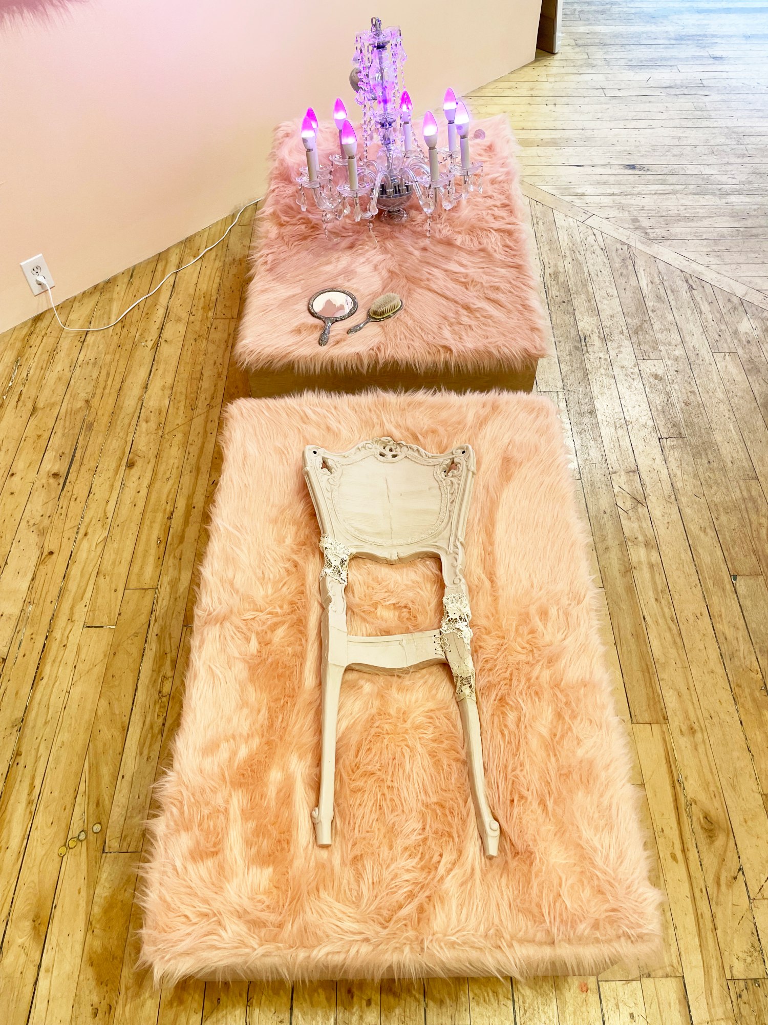 • cast chair back in vitreous china, salvaged hand made lace shag rugs, salvaged chandelier brush and mirror