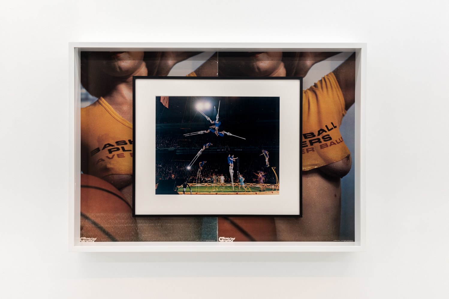 wood, acrylic, UV plexi, vintage NBA poster layered with Moscow Circus Acrobats by Dr. Harold Edgerton