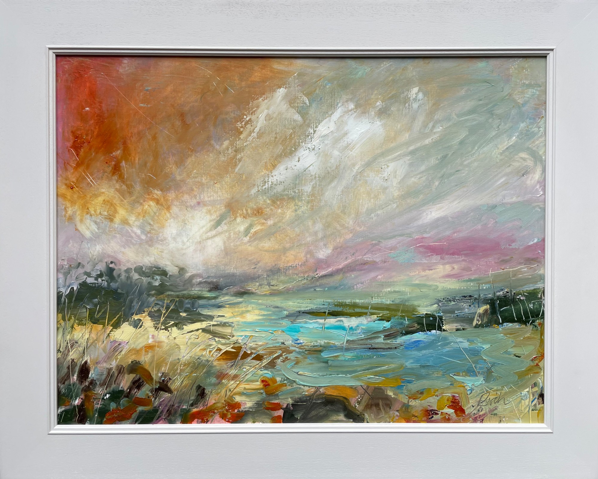 Oil painting in wooden frame handpainted Little Greene Rolling Fog overall framed size h61 x w76 cms