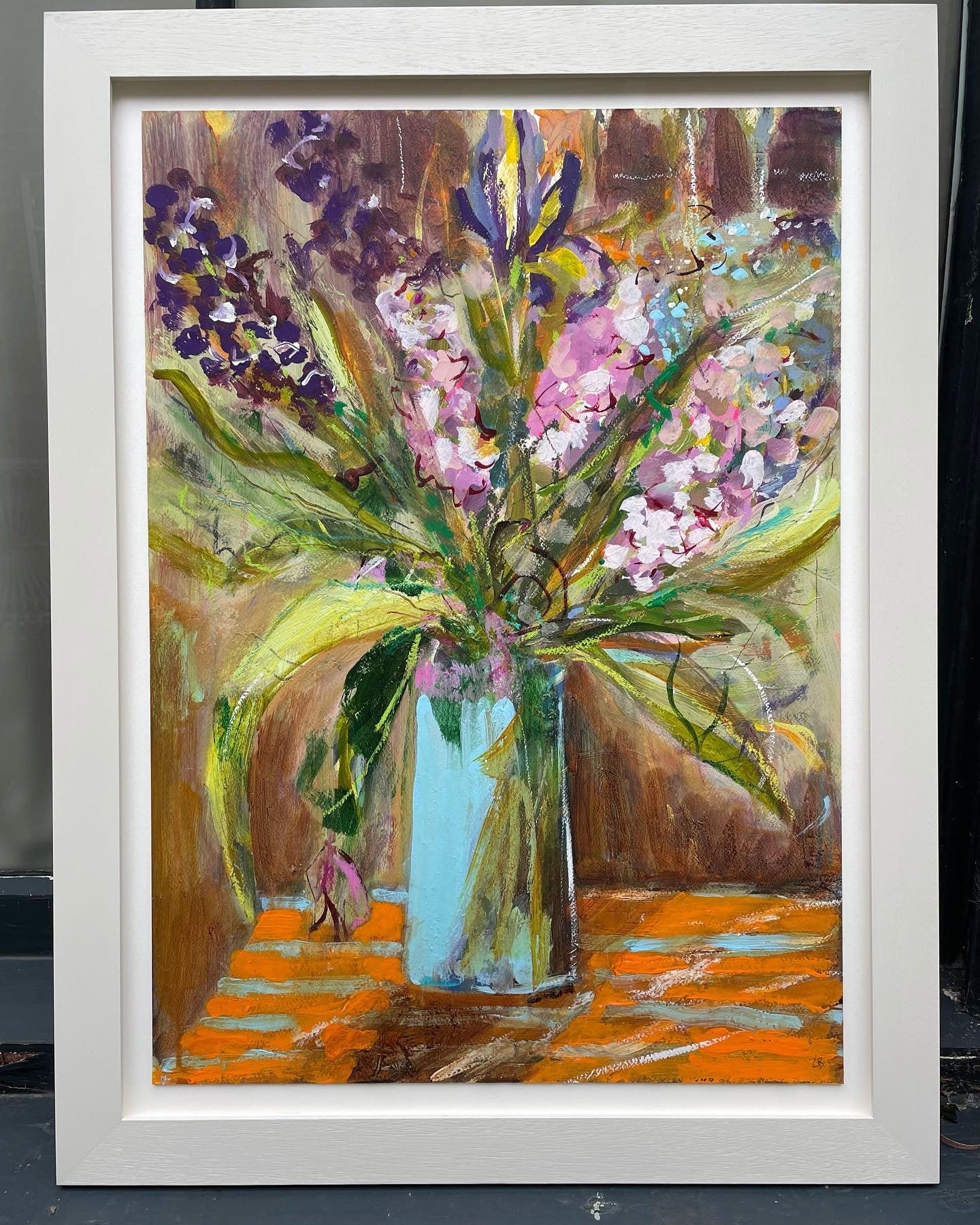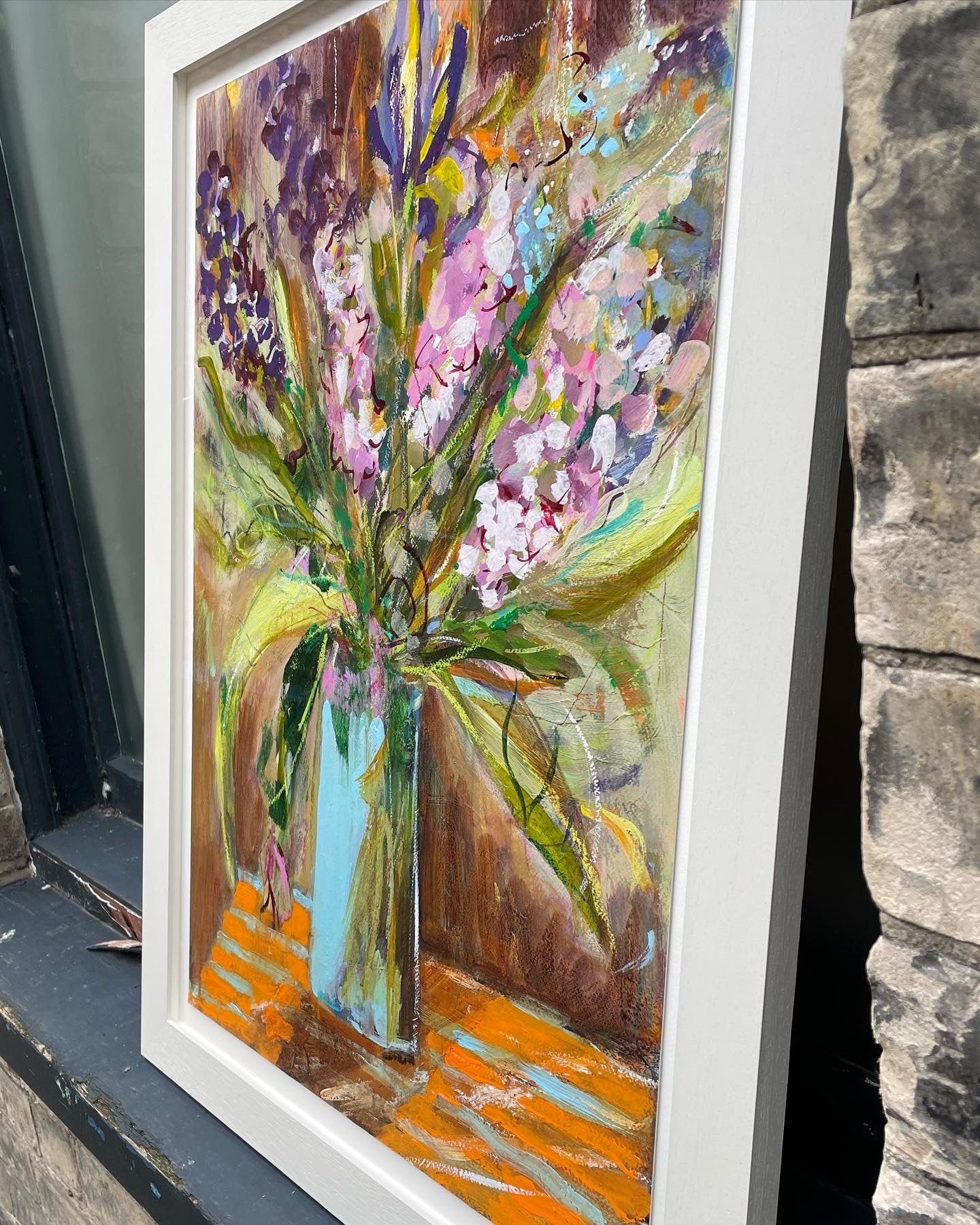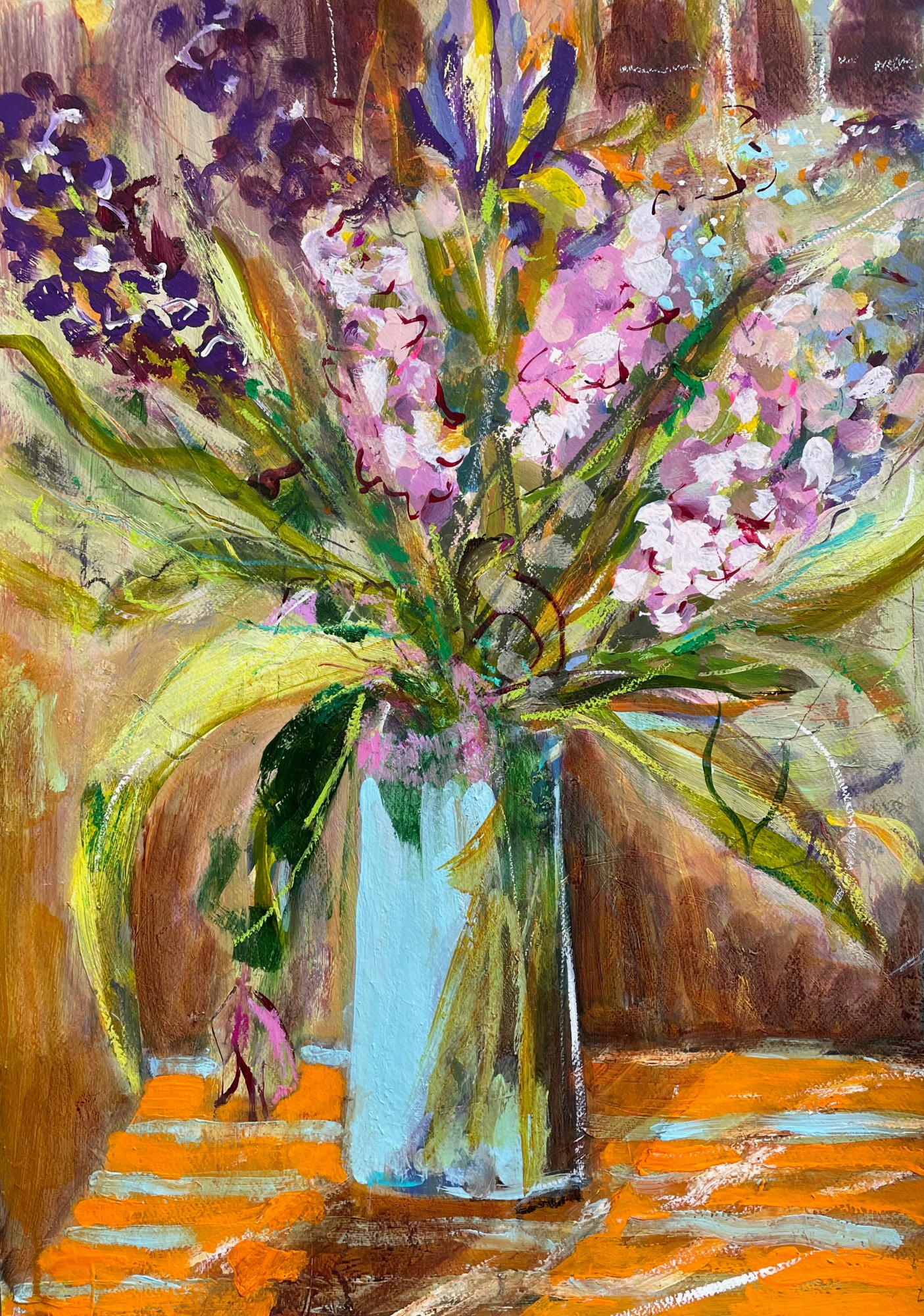 "Stocks and Iris seem to explode in joy on a bright tablecloth." Lesley Birch