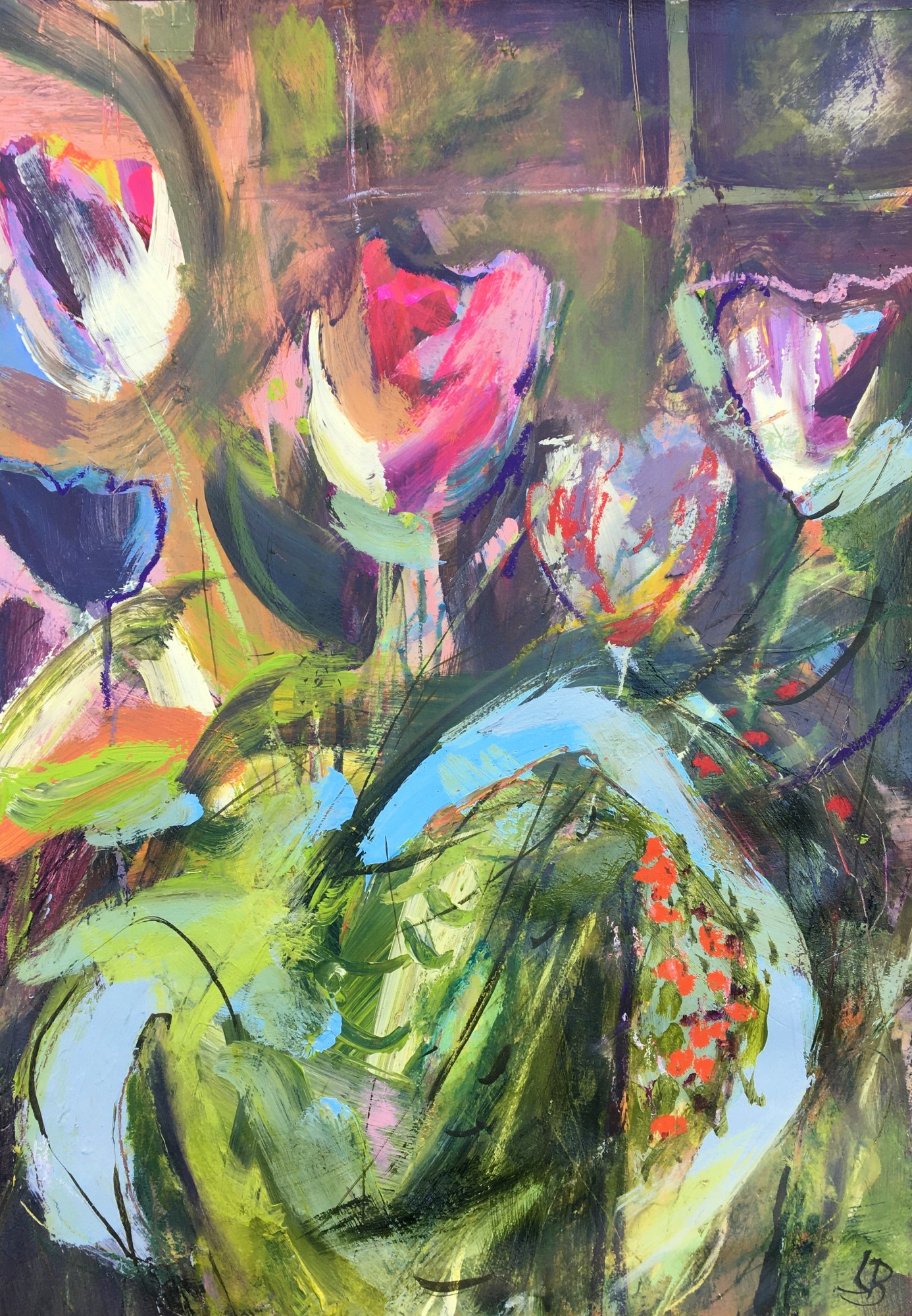 "There is an inside window in my studio space. I love its quirkiness and I place my jugs of flowers there." Lesley Birch 2021